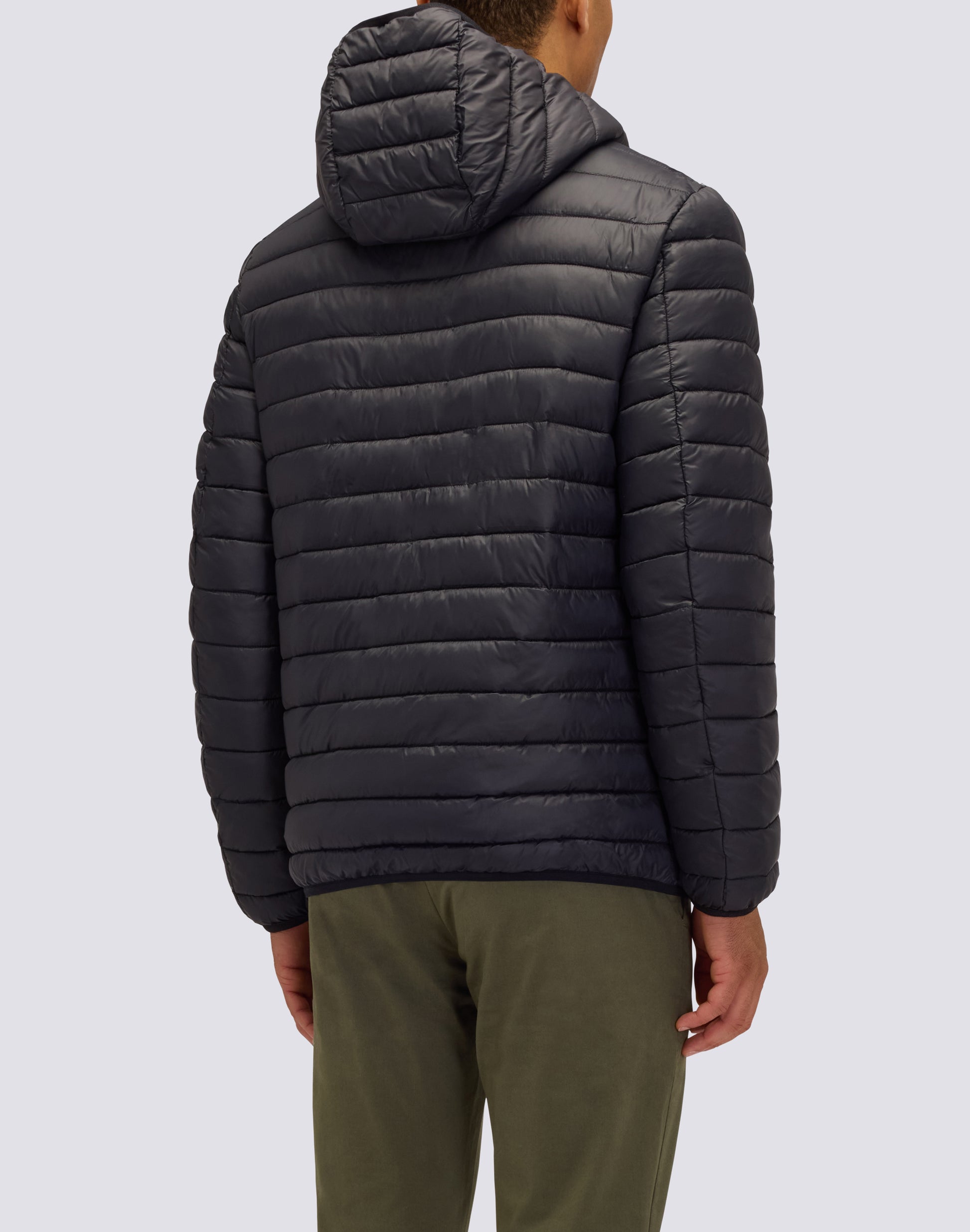 Chaqueta corta para hombre con capucha, confeccionada en tejido de nailon opaco superligero acolchado con canales horizontales y con relleno interior de fibra sintética de poliéster reciclado Repreve. Prenda dotada de numerosos detalles técnicos que la convierten en una chaqueta funcional y práctica. Corte regular, grado de calor medio.