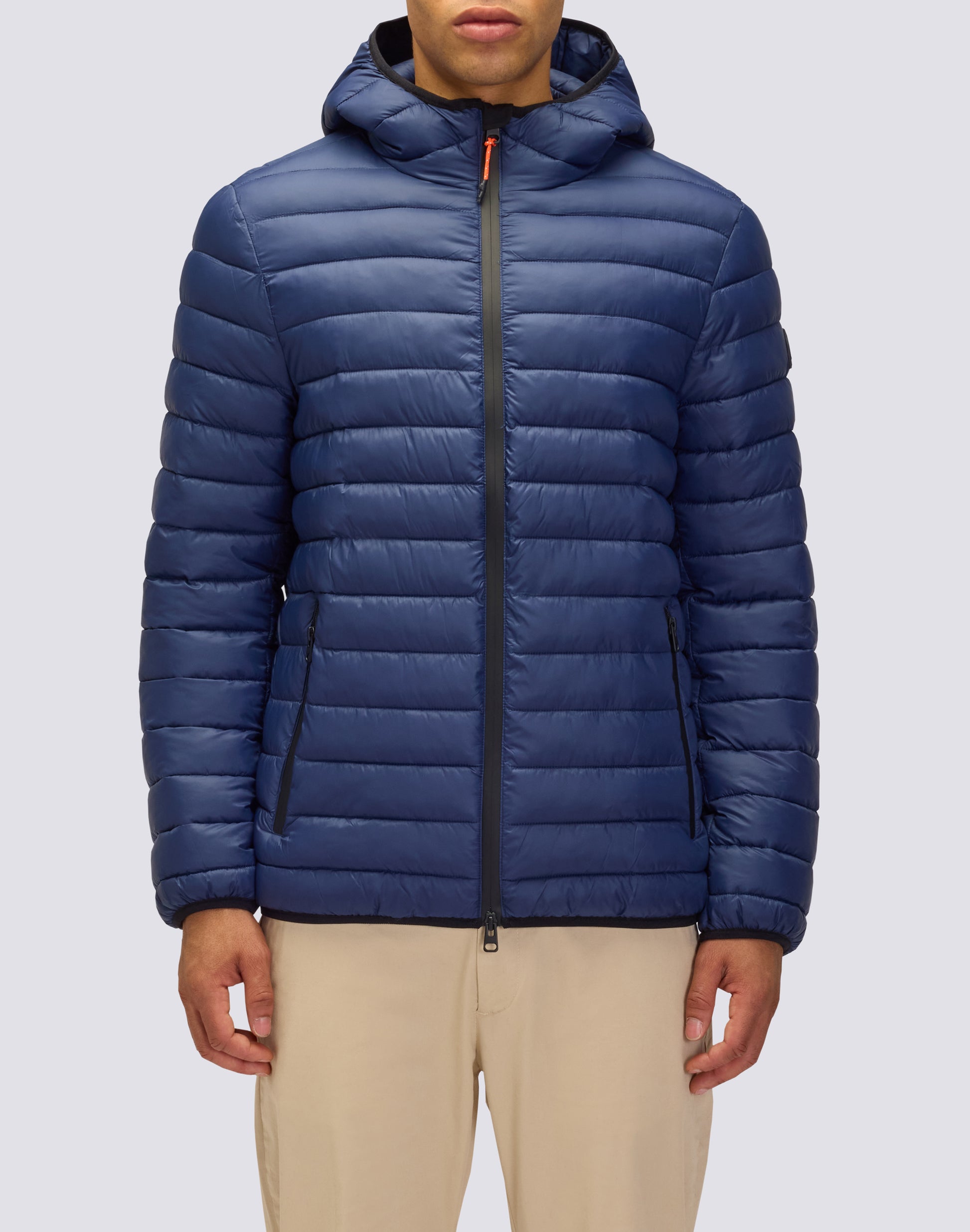 Chaqueta corta para hombre con capucha, confeccionada en tejido de nailon opaco superligero acolchado con canales horizontales y con relleno interior de fibra sintética de poliéster reciclado Repreve. Prenda dotada de numerosos detalles técnicos que la convierten en una chaqueta funcional y práctica. Corte regular, grado de calor medio.