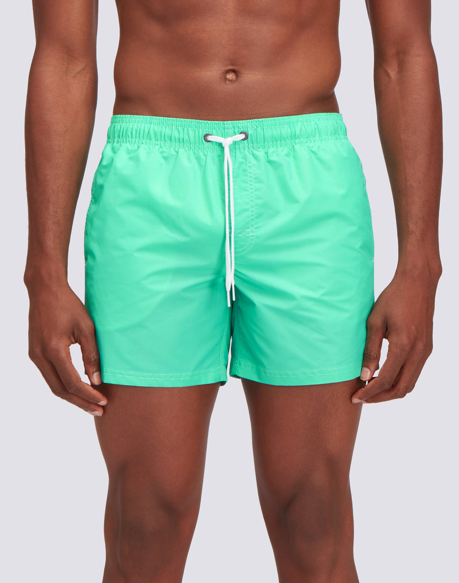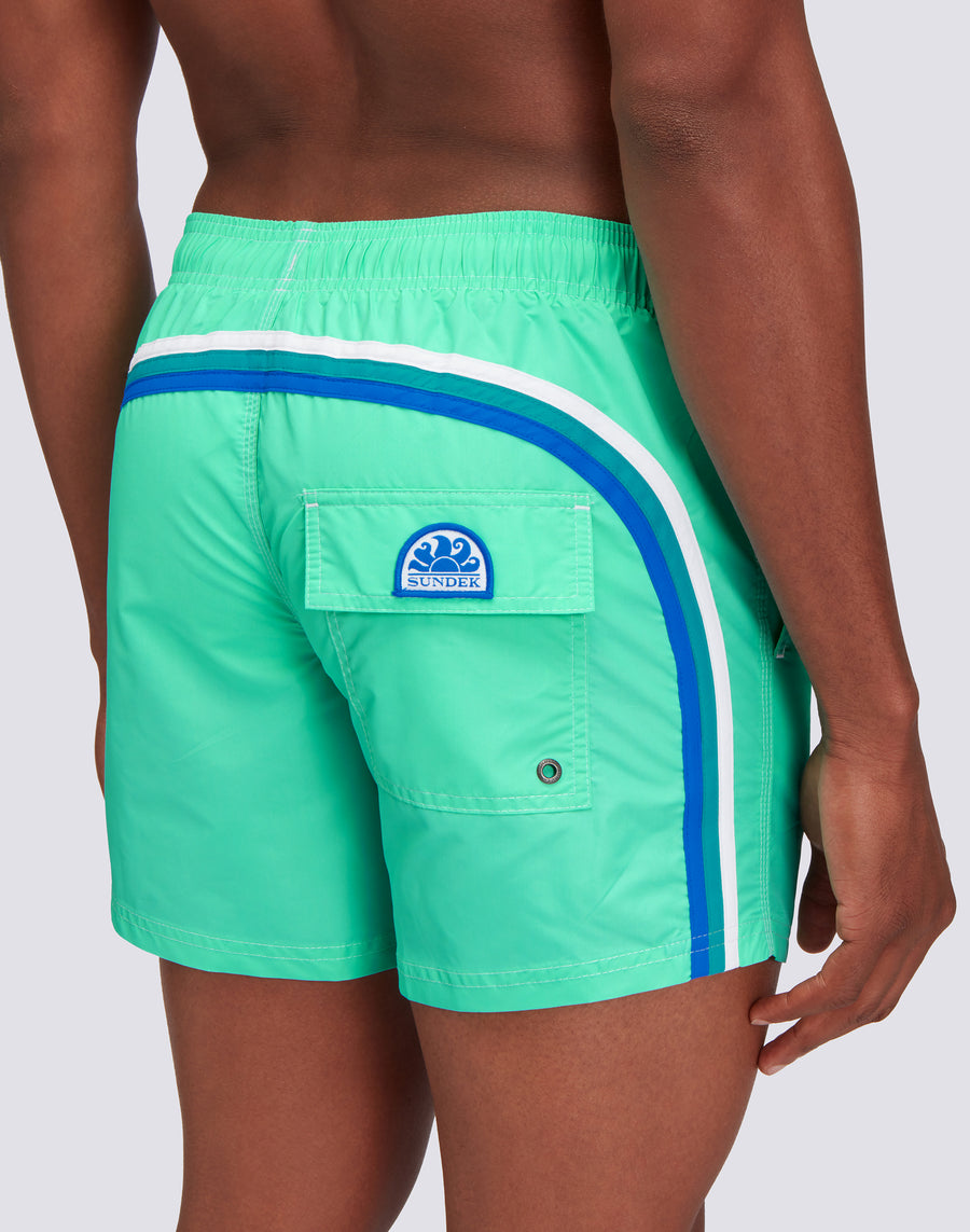 Pantalones cortos de mar para hombre con cintura elástica, cordón y el icónico arcoíris de Sundek en la espalda. Este traje de baño está hecho con costuras de tres agujas y 100% de nuestro tejido heritage, nylon-tafetán: suave como la seda, ligero y resistente a todo, se seca muy rápido para brindarte comodidad en todas partes, en las olas y fuera del agua. Longitud 35 cm (tamaño M), medido en el lado externo de la pierna.
