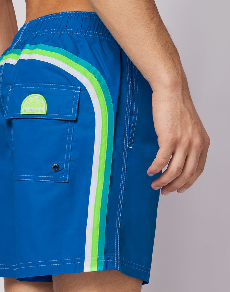 Todo el estilo Sundek atemporal en este bañador de longitud media con cintura elástica. Elegante, cómodo, construido para durar vacaciones tras vacaciones: es nuestro clásico bañador con cordón en la cintura y un arcoíris contrastante en la espalda, confeccionado en nuestra tradicional tela de tafetán de nailon que es liviana y de secado rápido, duradera, con costuras de tres agujas para un refuerzo más.