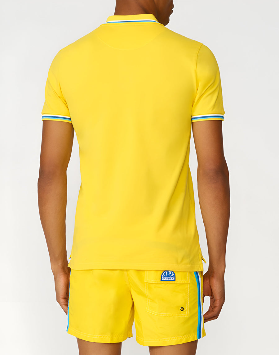 El polo de hombre tiene que ver con los detalles con el cuello y los puños detallados con el icónicas bandas tricolores, la firma de Sundek. Perfecta para combinar con vaqueros, pantalones casual y bermudas, dando un toque de personalidad a los outfits.