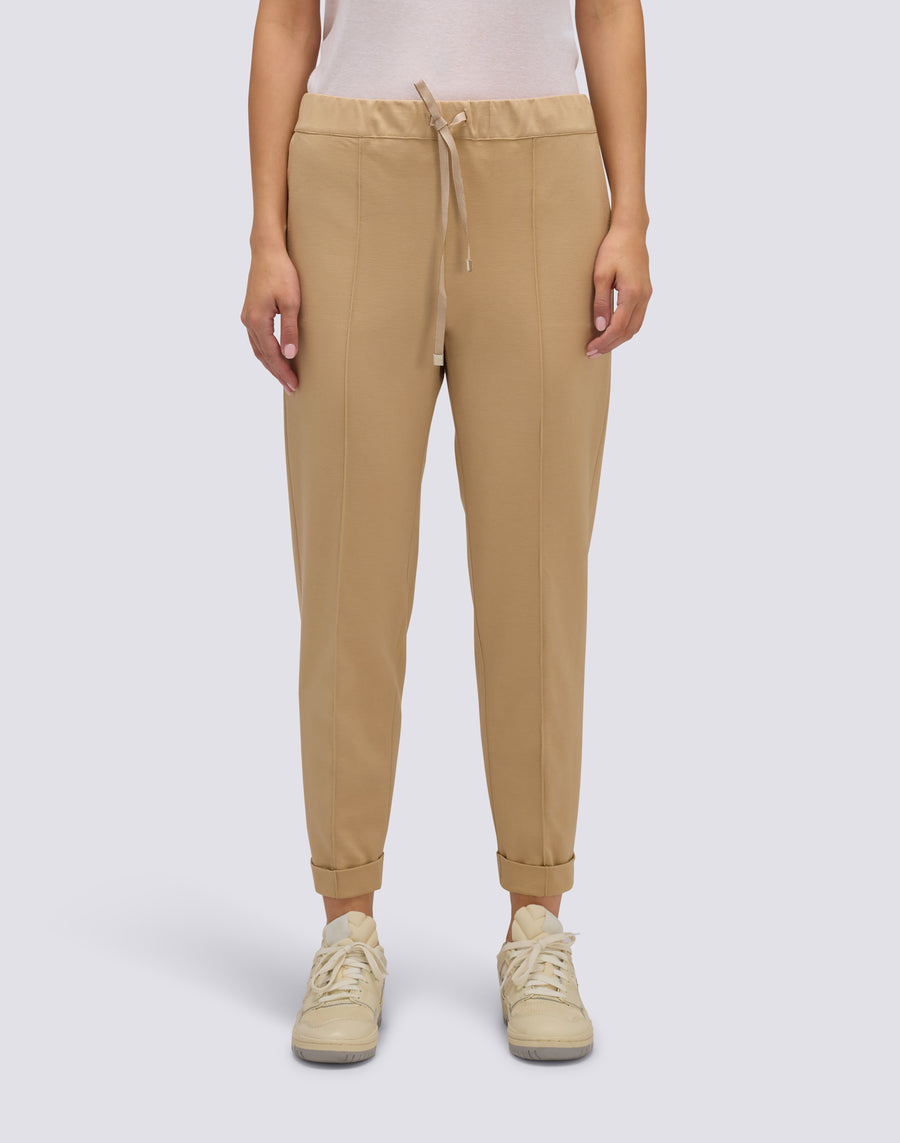 Pantalones largos de mujer en punto Milan con cordón ajustable en la cintura, bolsillos laterales, pinza central delantera y bajos fijos con vuelta. Corte pitillo. Ajuste slim.