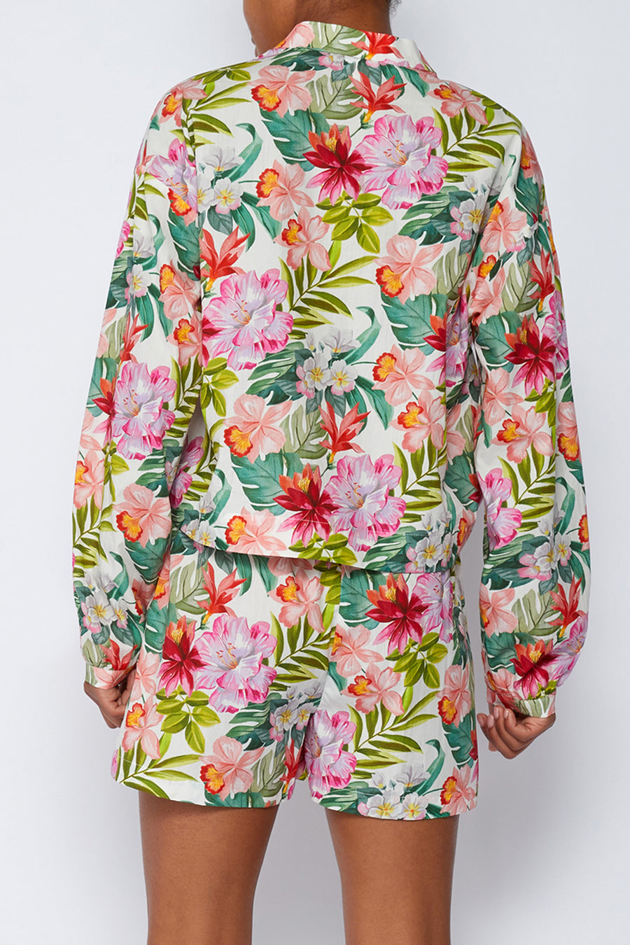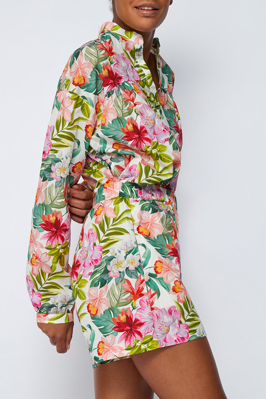 Permítete inspirarte en la impresión floral que caracteriza esta blusa de algodón con el cuello coreano. Perfecto en momentos de relajación en la ciudad para completar looks casuales con un toque de gran personalidad. Complete su guardarropa de verano de primavera con esta camisa, para combinarse con pantalones cortos coordinados.