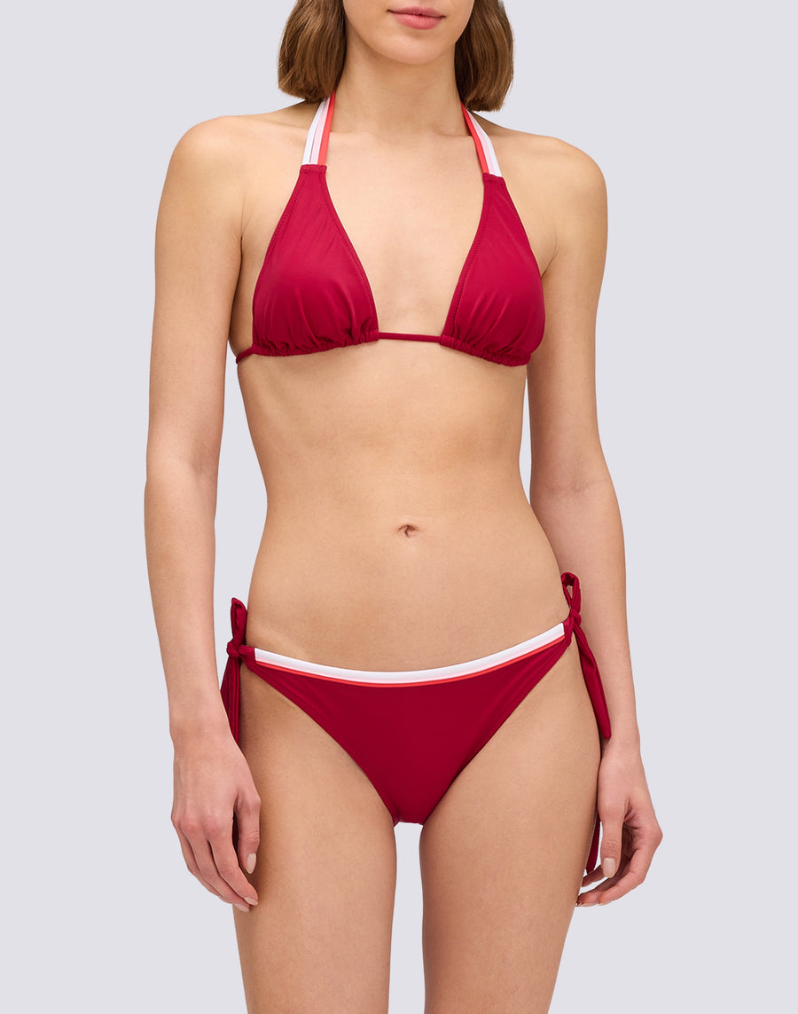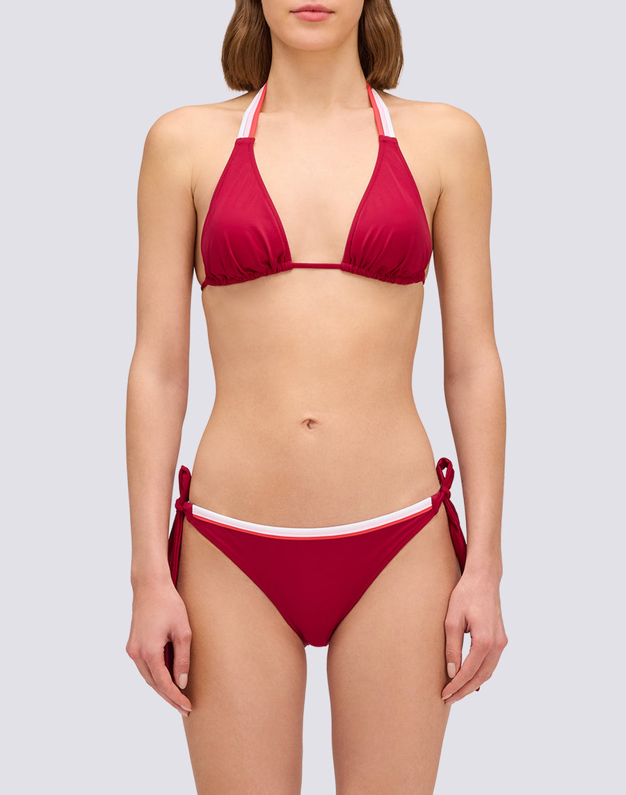 Las bandas tricolores al estilo Sundek hacen único este bikini de mujer compuesto por un triángulo amplio y braguitas ajustables. Añade a tu repertorio de ropa de playa este bikini compuesto por un sujetador triangular amplio acolchado y braguitas regulares con laterales ajustables. La prenda está personalizada con bandas tricolores que enriquecen los cordones del triángulo y la banda de la cintura de las braguitas.