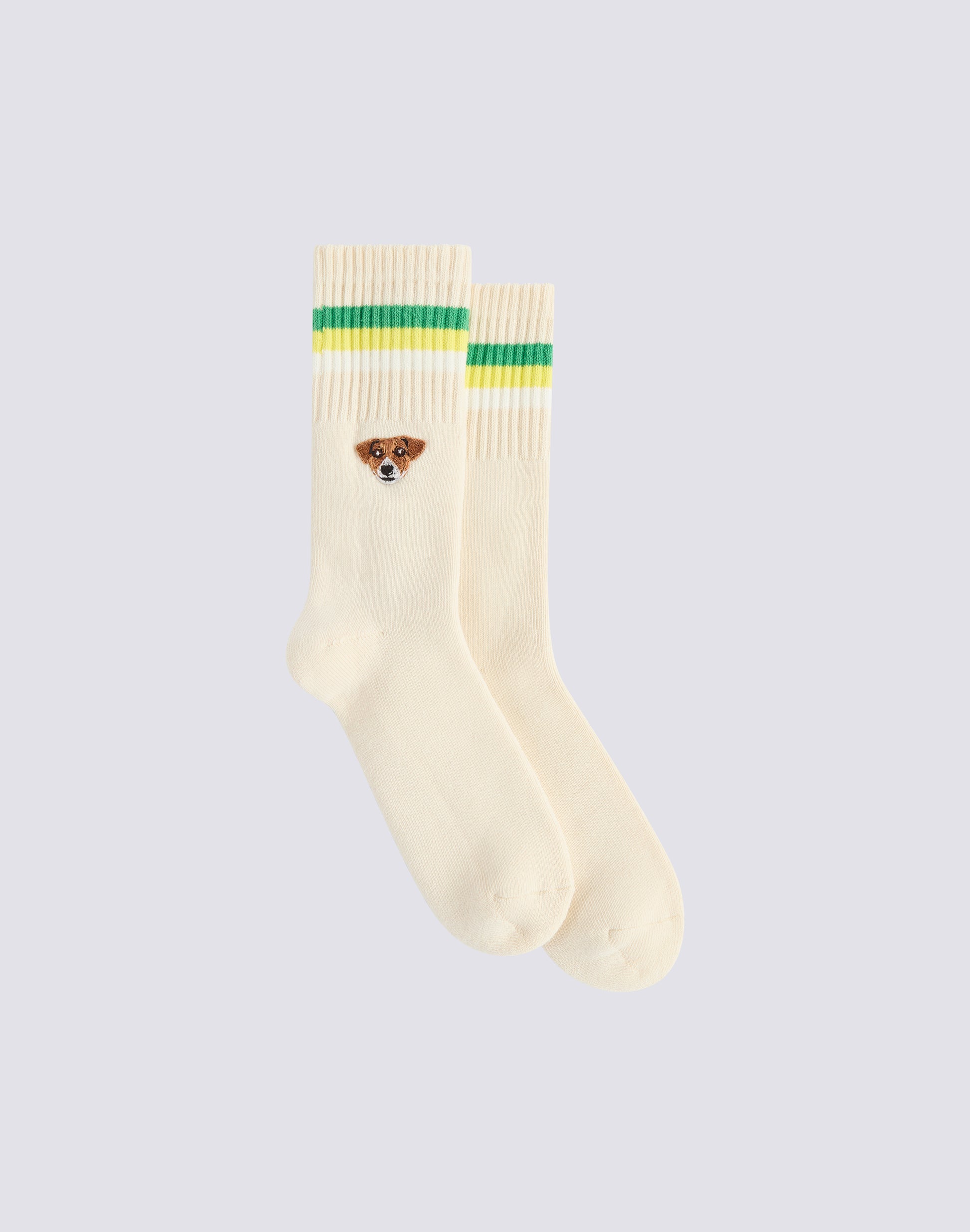 Calzino in cotone della capsule Sundek & Pelo Foundation, decorato con la patch del Jack Russell. Questo accessorio unisce comfort e stile, perfetto per gli amanti dei cani che desiderano esprimere la loro passione anche nei dettagli.