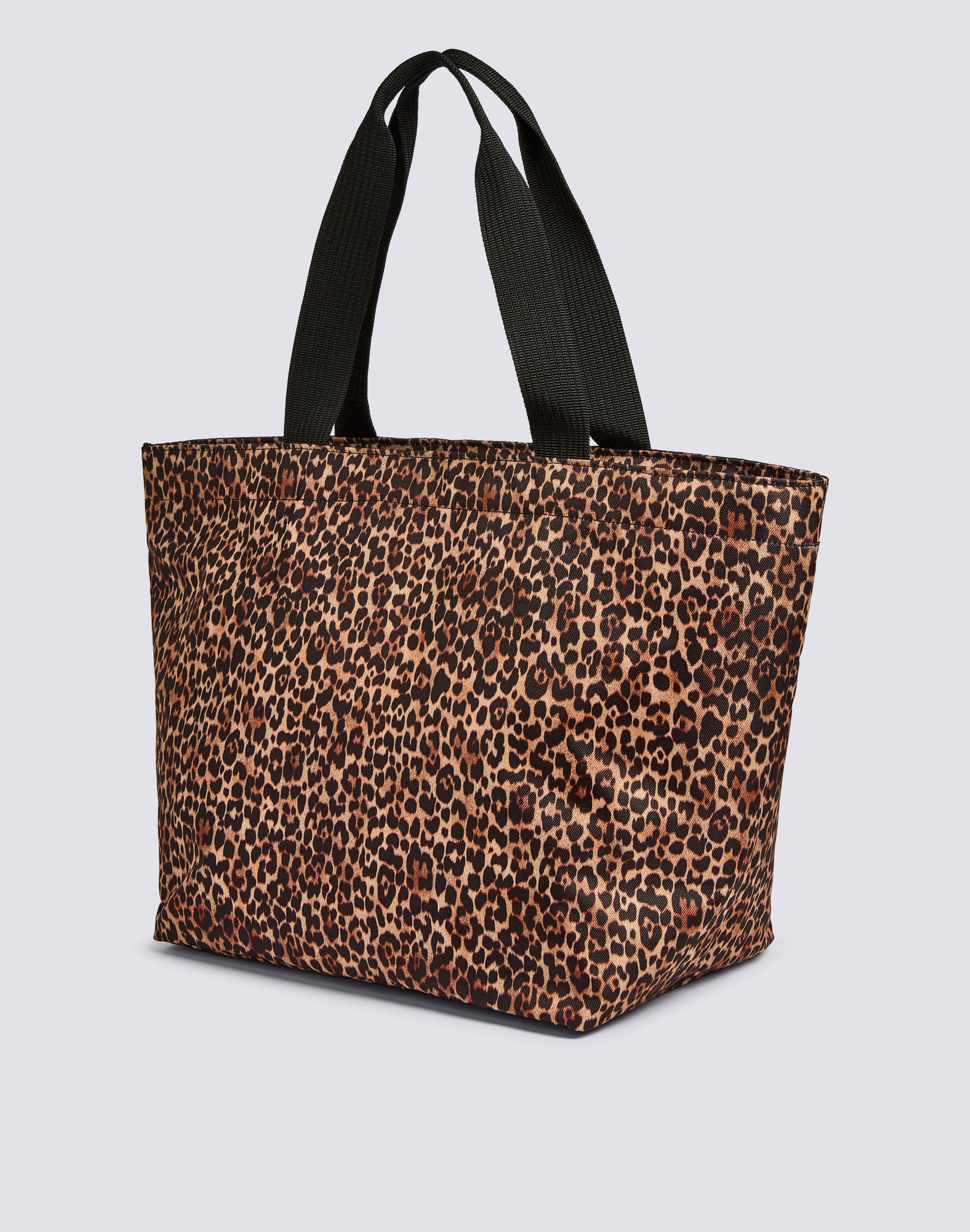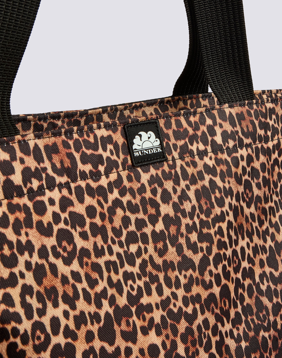 Tote bag formato regular in fantasia leopardata con chiusra con zip più manici. Per rendere stravaganti anche outfit più basici.