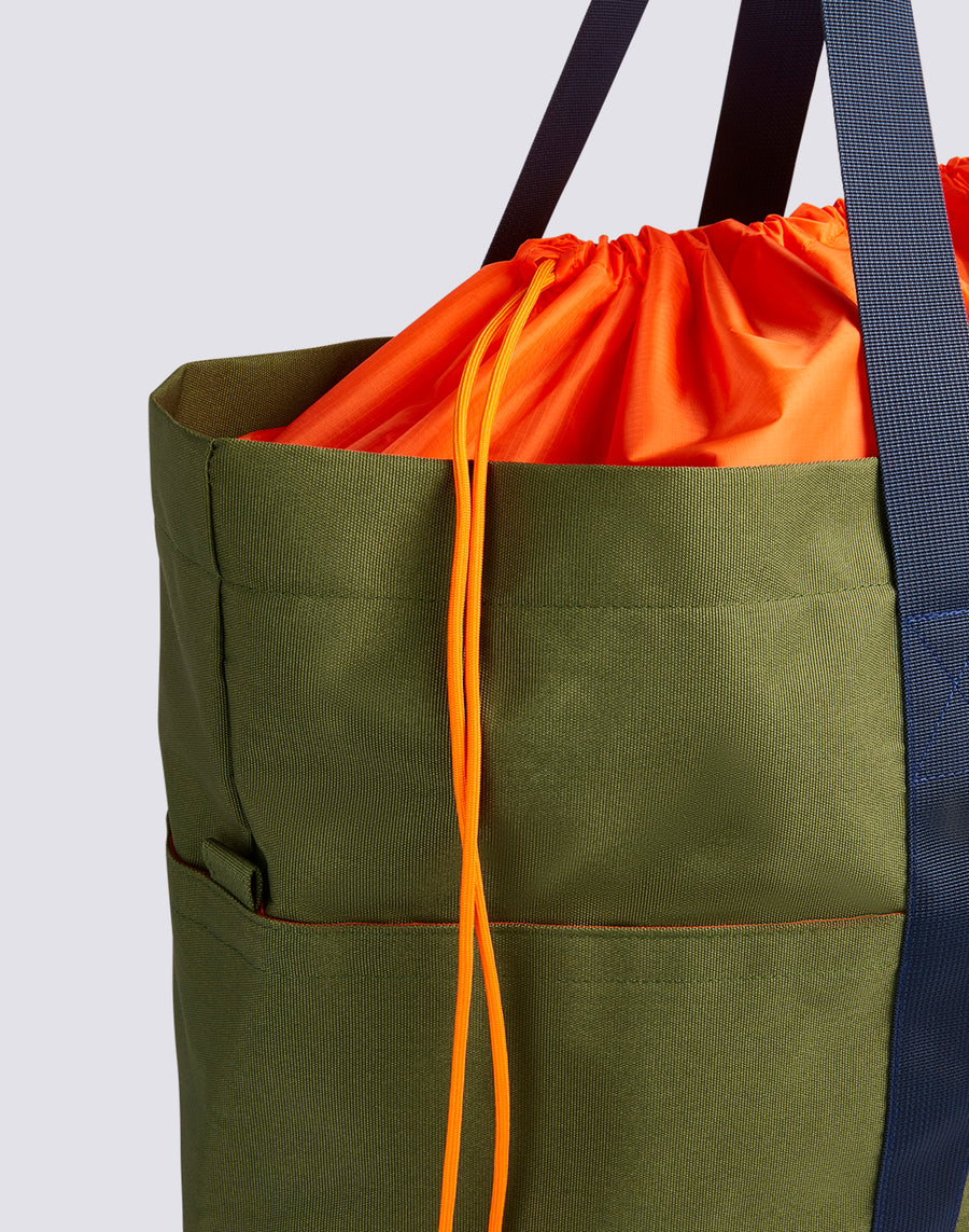 Military tote bag con dettagli a contrasto, tasche laterali, manici e coulisse per regolare la chiusura. Ampia e capiente, si presta a numerose occasioni d'uso.