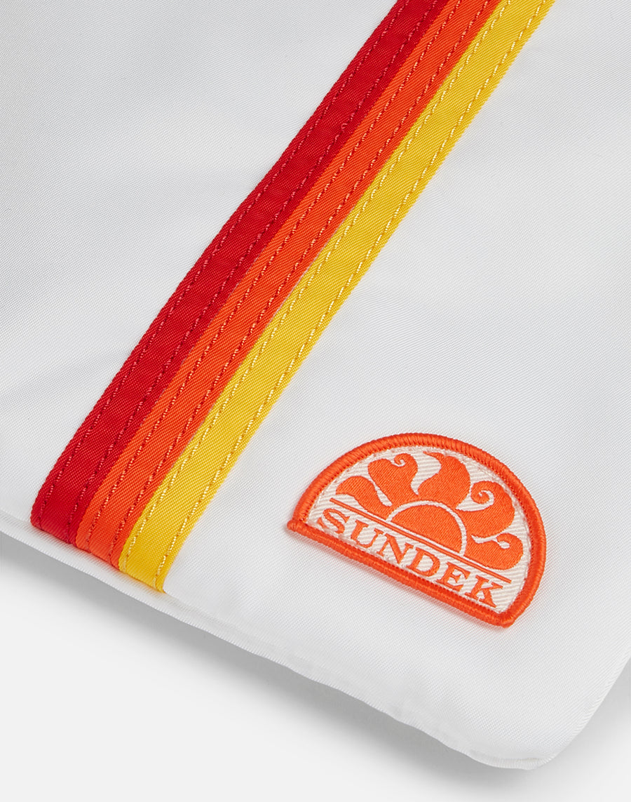Pochette mare leggera e foderata con il dettaglio iconico dei nastri tricolore per custodire e proteggere l'essenziale che preferisci tenere a portata di mano. Perfetta da portare in borsa o da sola grazie alla pratica asola passamano.