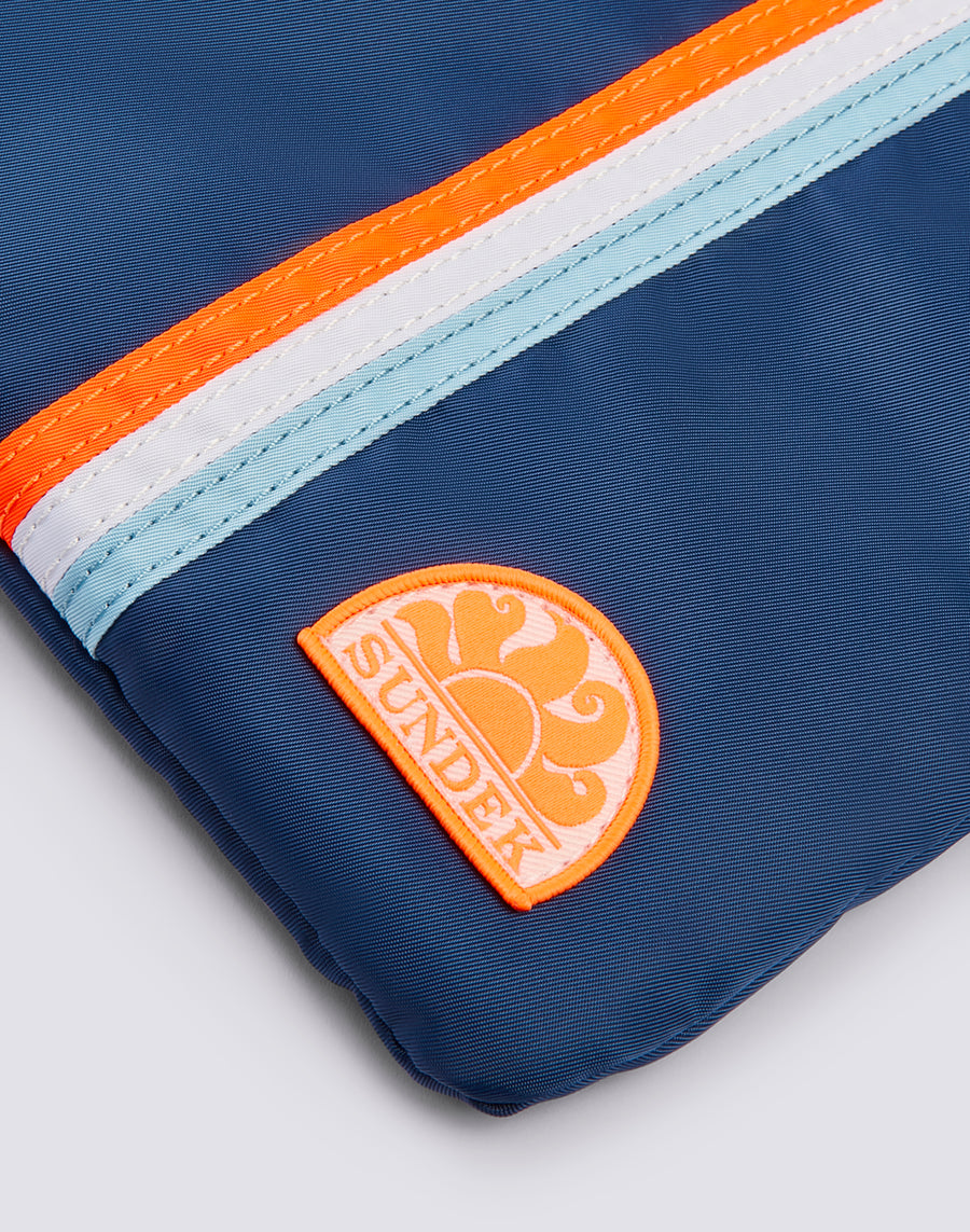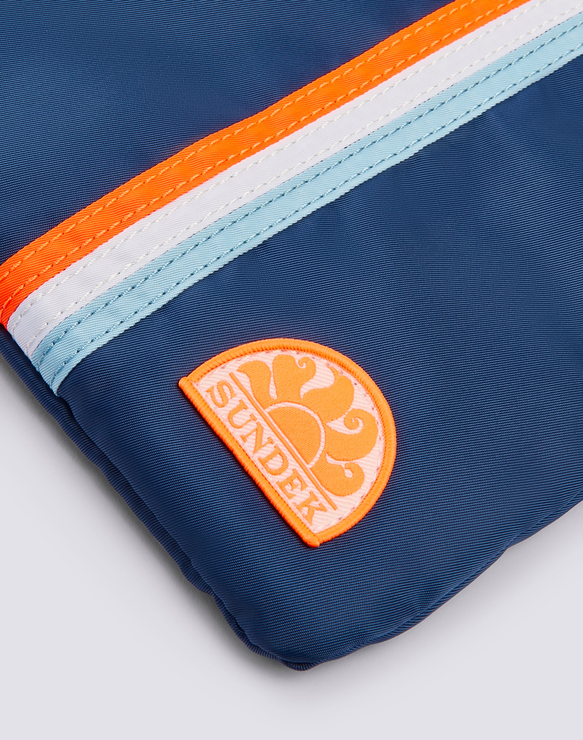 Pochette mare leggera e foderata con il dettaglio iconico dei nastri tricolore per custodire e proteggere l'essenziale che preferisci tenere a portata di mano. Perfetta da portare in borsa o da sola grazie alla pratica asola passamano.