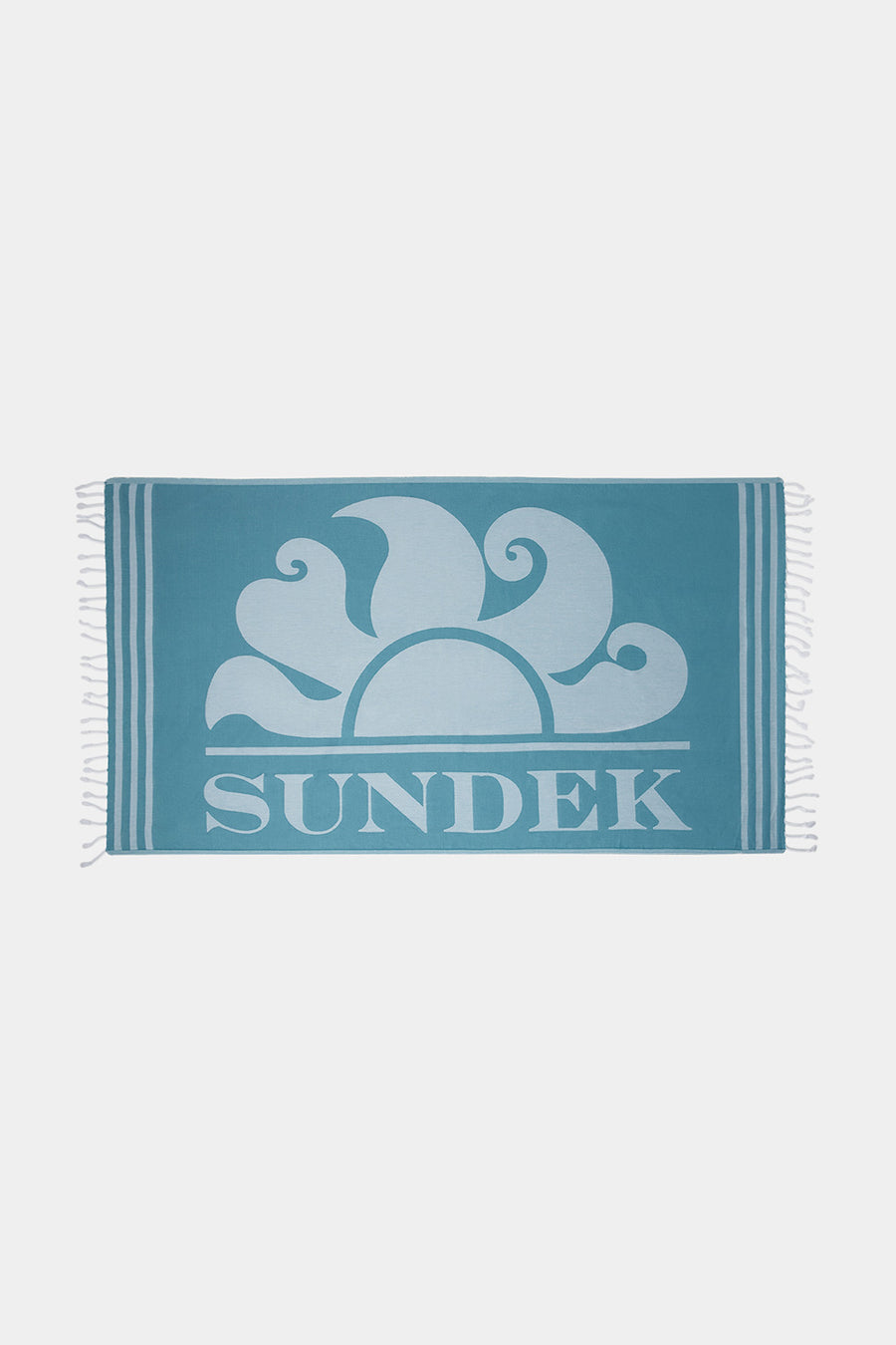 Telo mare fouta jacquard con maxi logo a contrasto con righe verticali e fondi con frange intrecciate. Lunghezza: 100x170 cm. Peso: 320 gr.