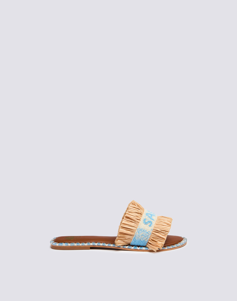 Ciabatta a fascia bassa interamente ricamata di perline in vetro e profilata da frange in raffia naturale. La suola è in vera pelle, anch'essa profilata da un ricamo artigianale in raffia.
