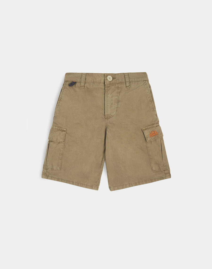 Walskshort cargo in tinto capo in cotone popeline. Leggeri, comodi, pratici e stilosi per correre in libertà. Dotati di chiusura con bottone e passante per la cintura. Arcobaleno iconico sul retro.