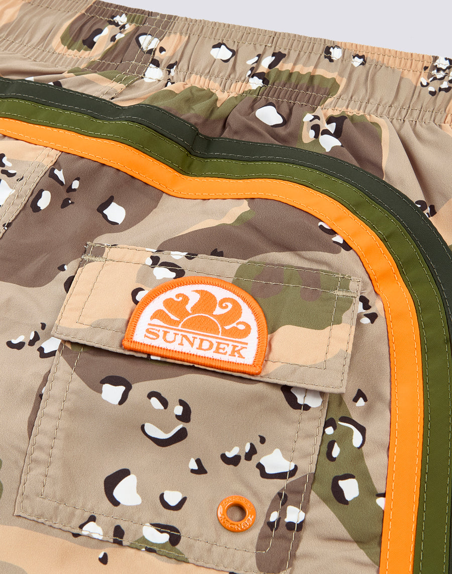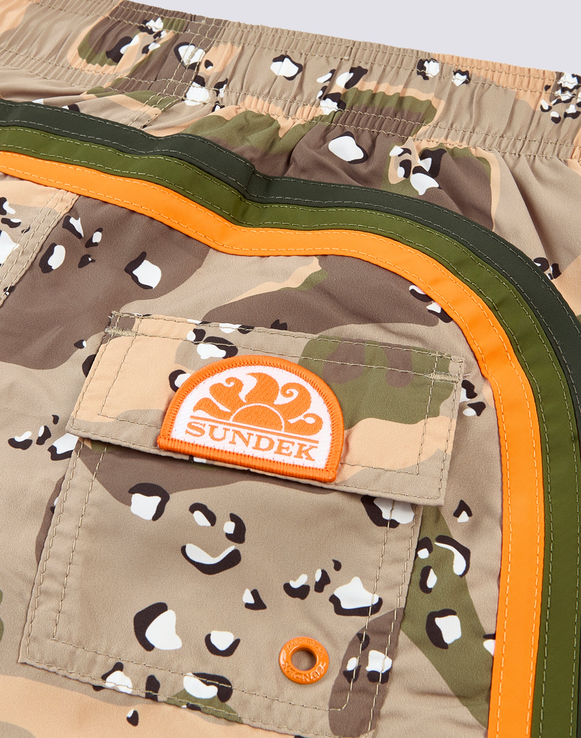 Costume da bagno con coulisse elastica in vita, in leggero tessuto Repreve® riciclato da bottiglie di plastica. Con stampa Spotted Camo e il tradizionale arcobaleno Sundek sul back. Lunghezza esterno coscia 10.25"/26 cm (in taglia 6anni).