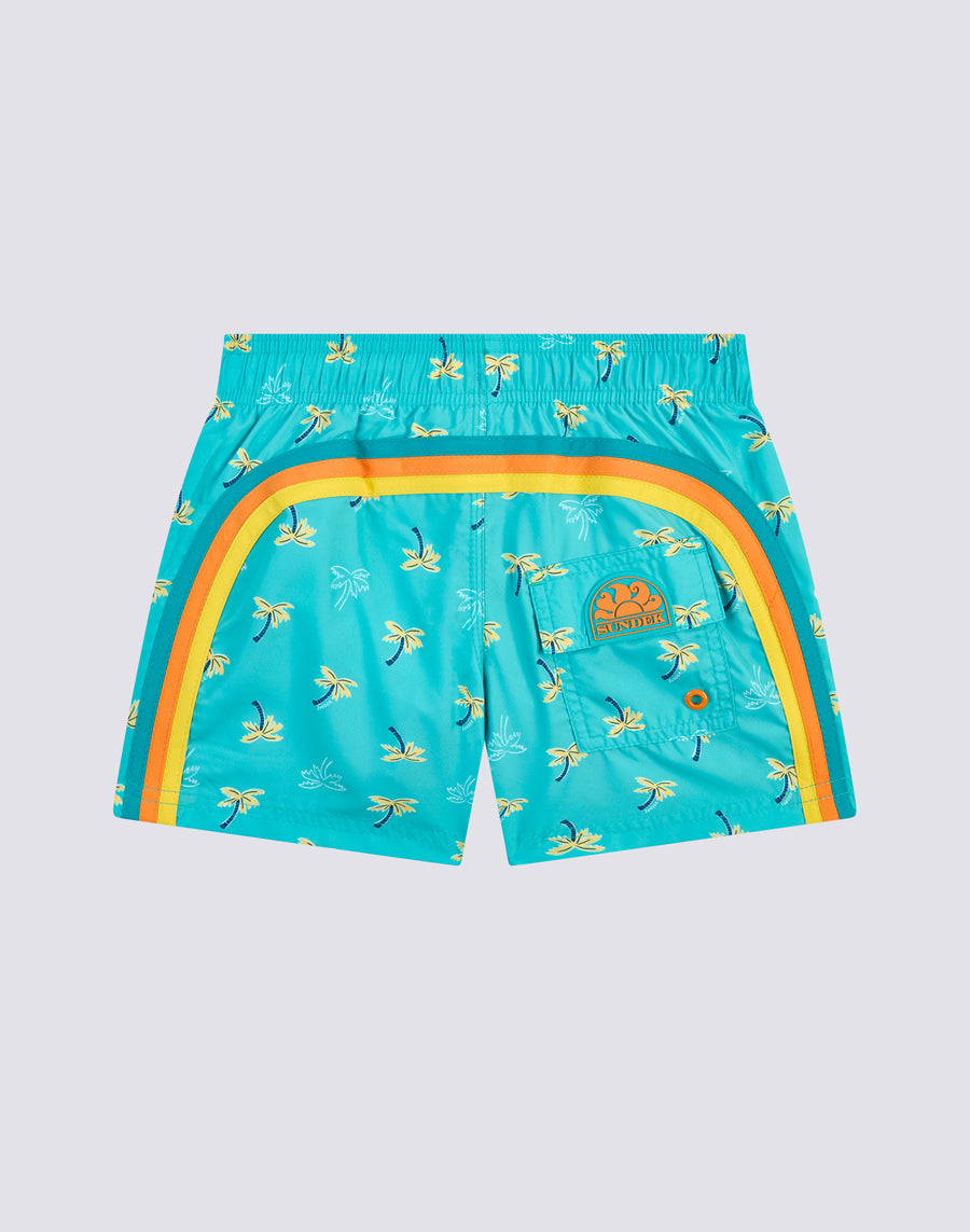 Costume da bagno con coulisse elastica in vita, in leggero tessuto Repreve® riciclato da bottiglie di plastica. Con stampa Cozy Palm e il tradizionale arcobaleno Sundek sul back. Lunghezza esterno coscia 10.25"/26 cm (in taglia 6anni).