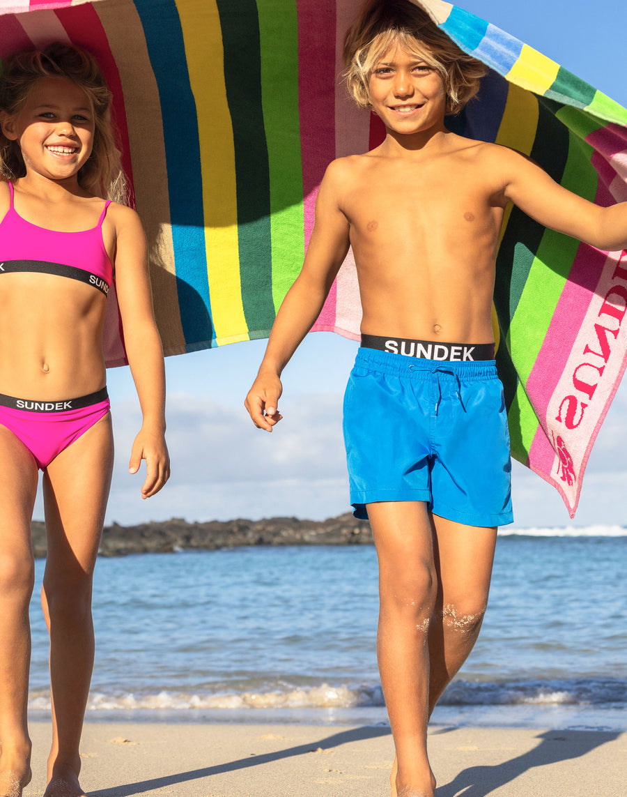 Un modello che accompagnerà il tuo bimbo nelle sue mille attività in vacanza, perfetto per muoversi e giocare in piena libertà. Dotato di elastico logo brandizzato, tasca posteriore e coulisse per regolare l'aderenza. Il poliestere leggero con cui è realizzato dona freschezza e una rapida asciugatura.