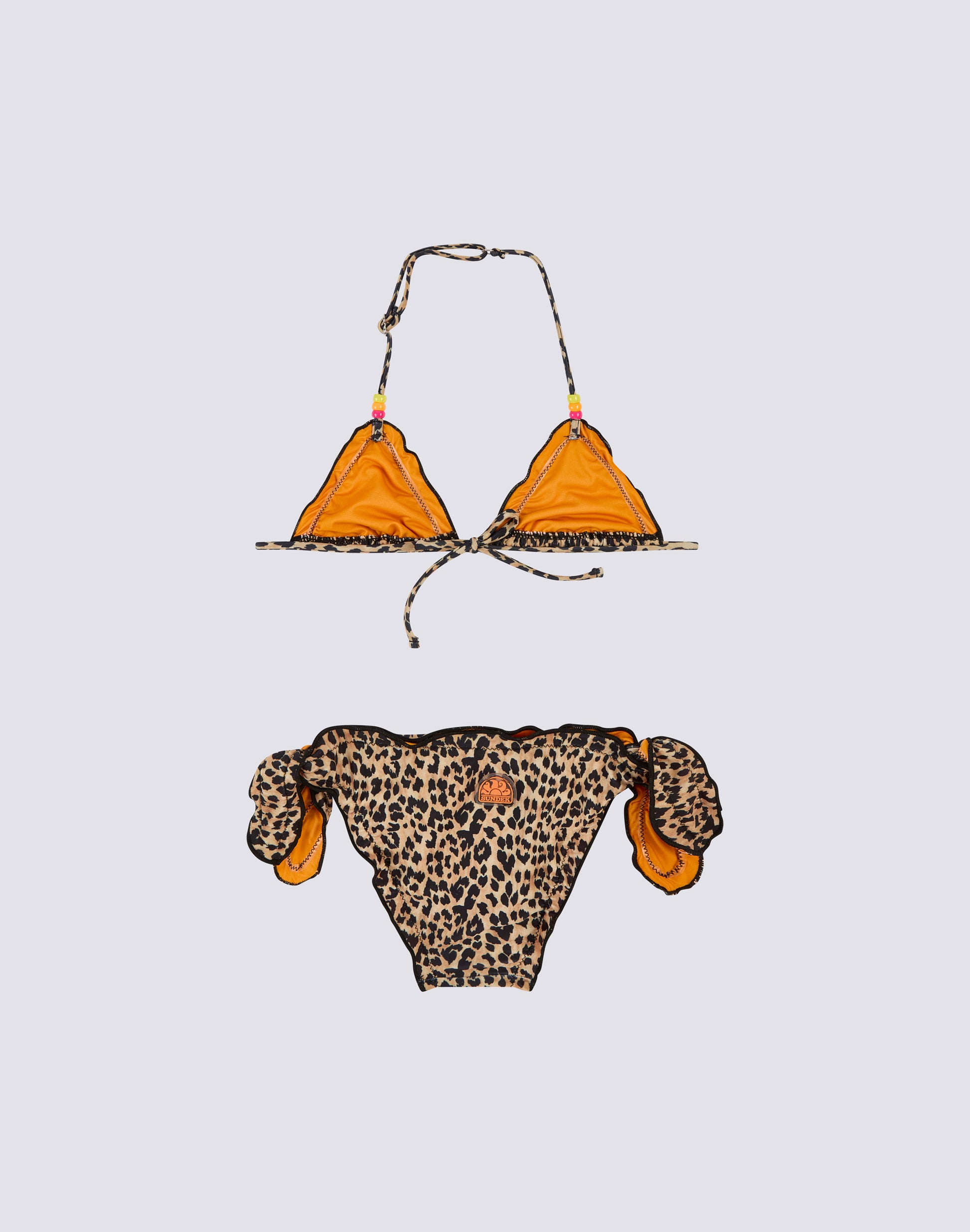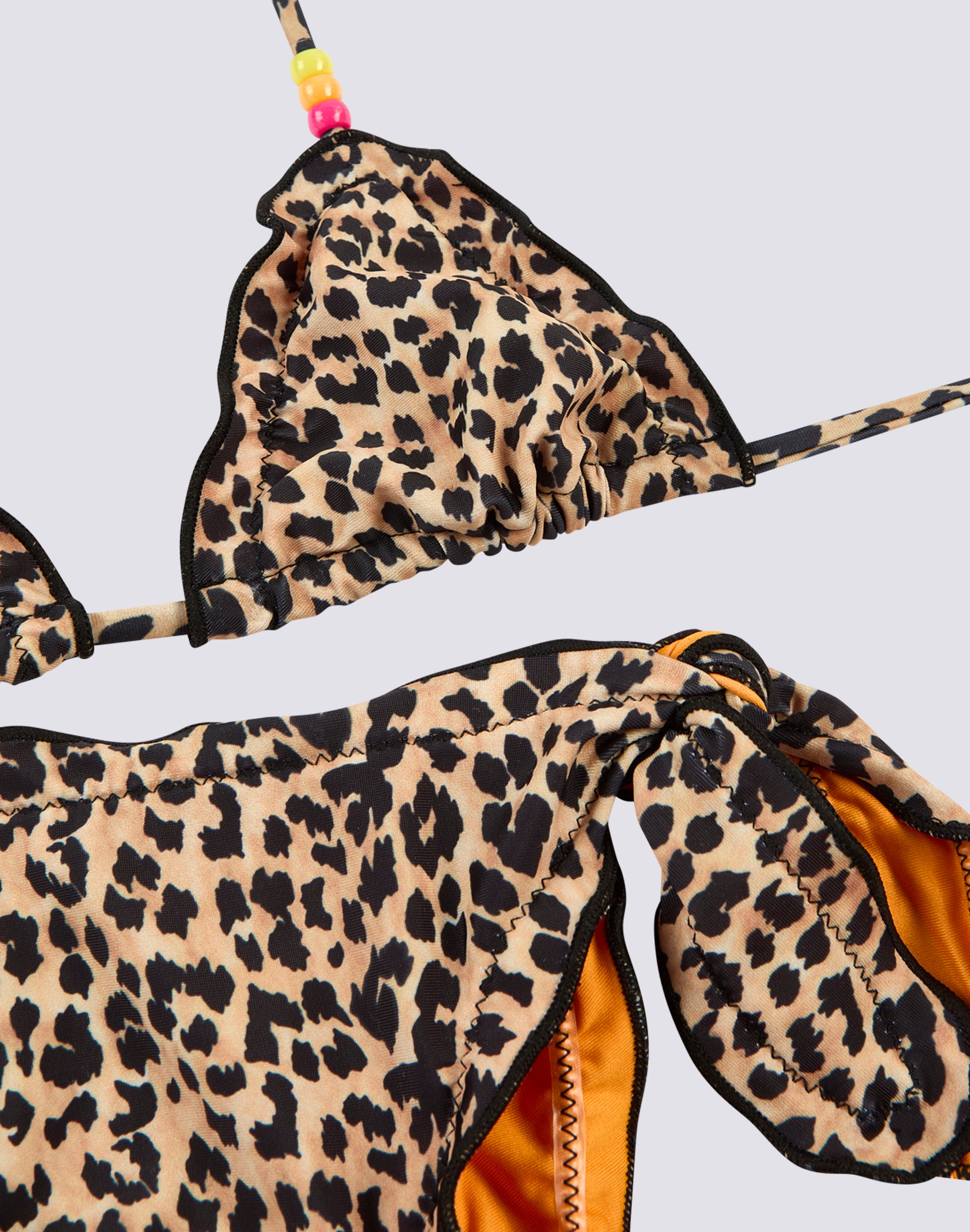 Bikini bambina formato da top a triangolino arricciato con laccetti regolabili e slip con fiocchi, anche questi regolabili e arricciati. Protagonista la stampa leopardata. Indossabile eventualmente coordinato con lo stesso modello in taglia donna.
