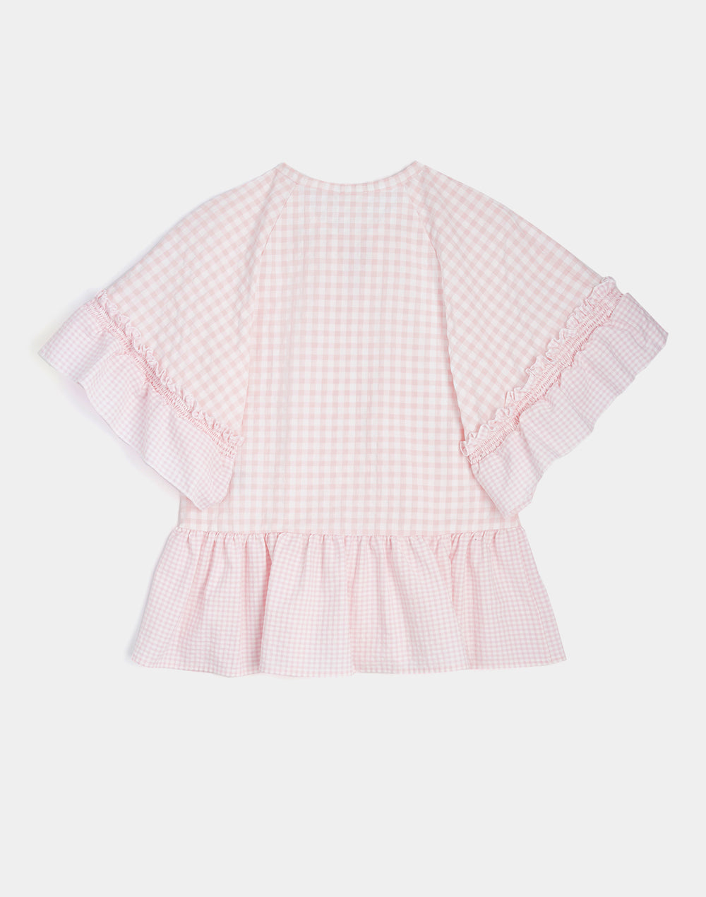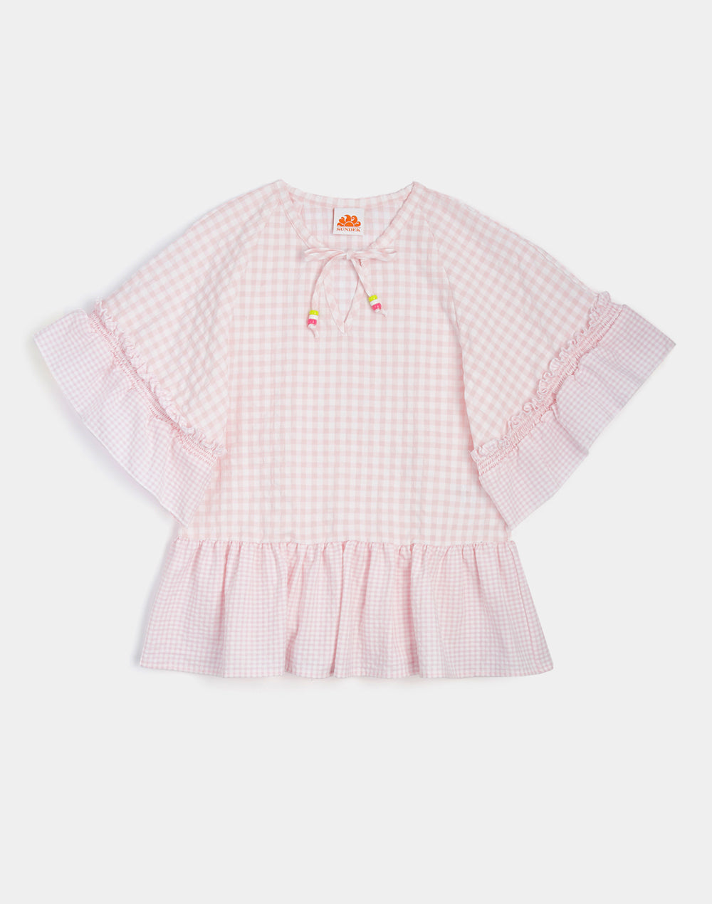 Mini kaftano in cotone vichy con maniche a taglio ampio, spacco a V frontale e lacci con perline.