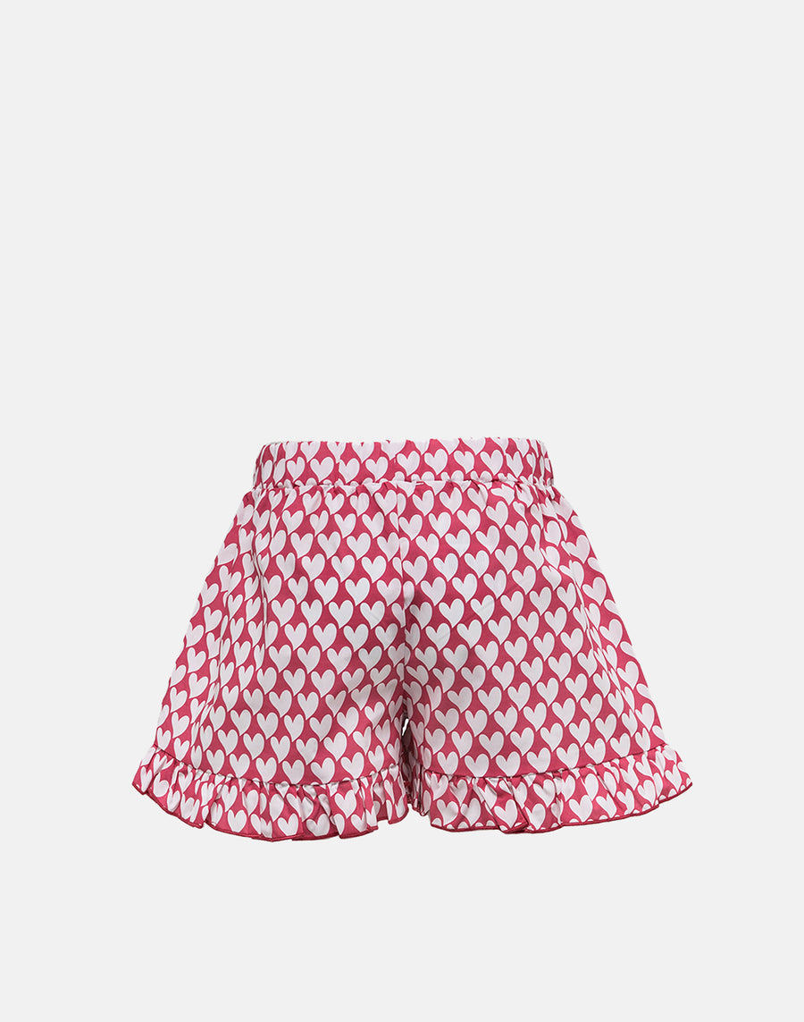 Donano una nota divertente e ricercata allo stile in qualunque circostanza. Gli shorts in popeline di cotone stretch sfoggiano una stampa all over a cuori e rouches al fondo.