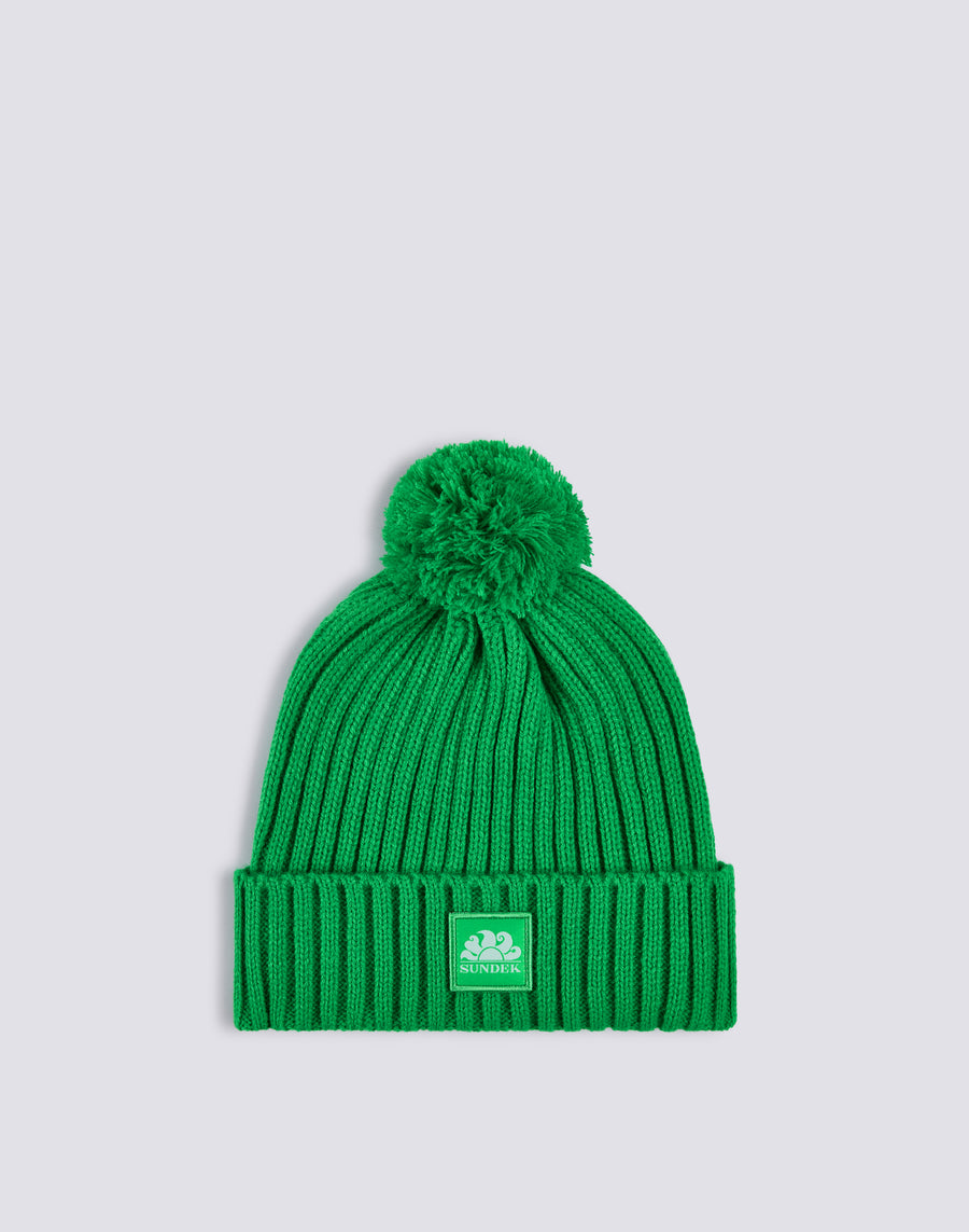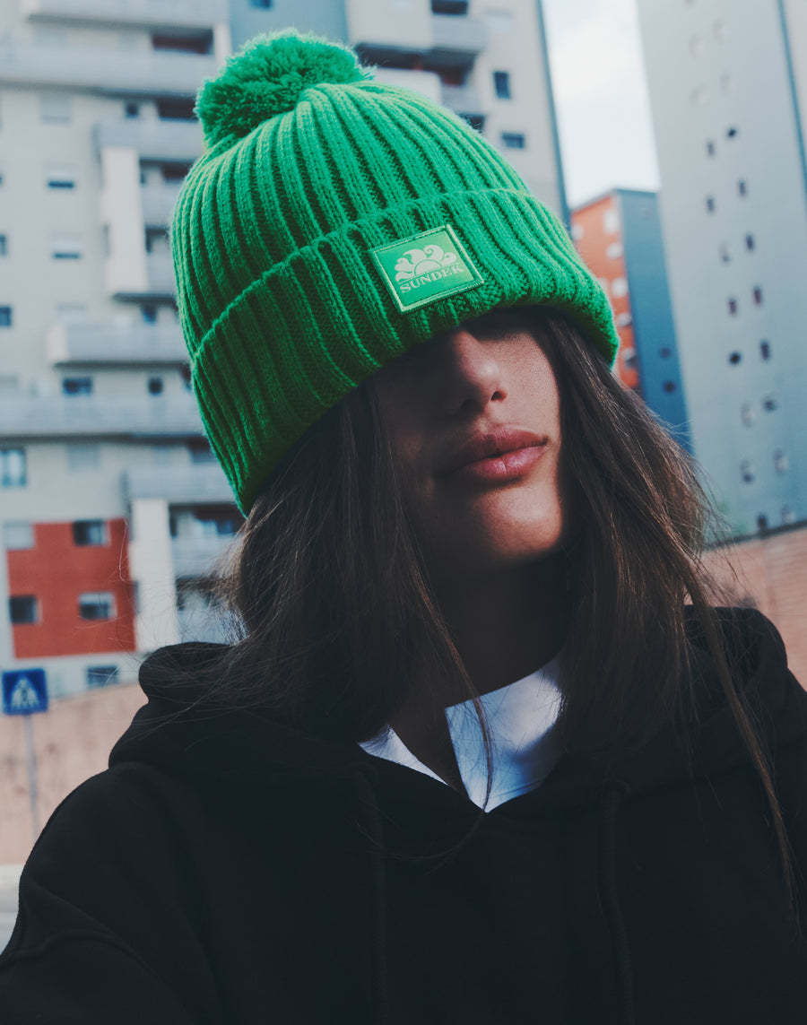 Filato morbidissimo per questo beanie con pom pom versatile dallo spirito sporty ricercato.