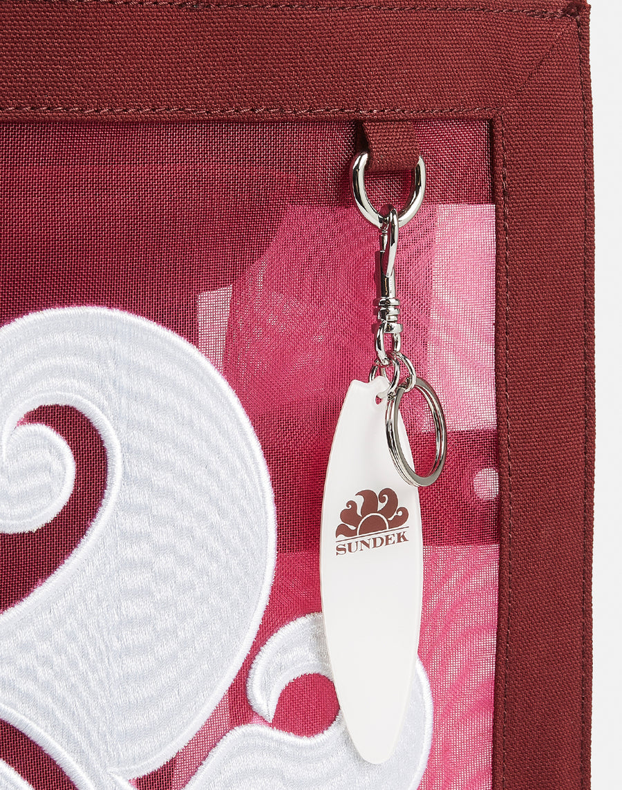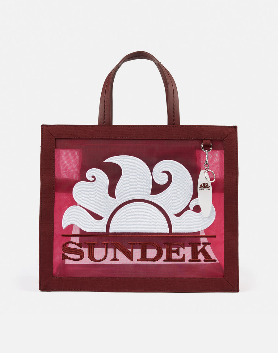Borsa in mesh con logo Sundek ricamato. Questa borsa è perfetta per la spiaggia grazie alla sua rete a trame sottili che impediscono il passaggio della sabbia. Charm tavola da surf applicato.
