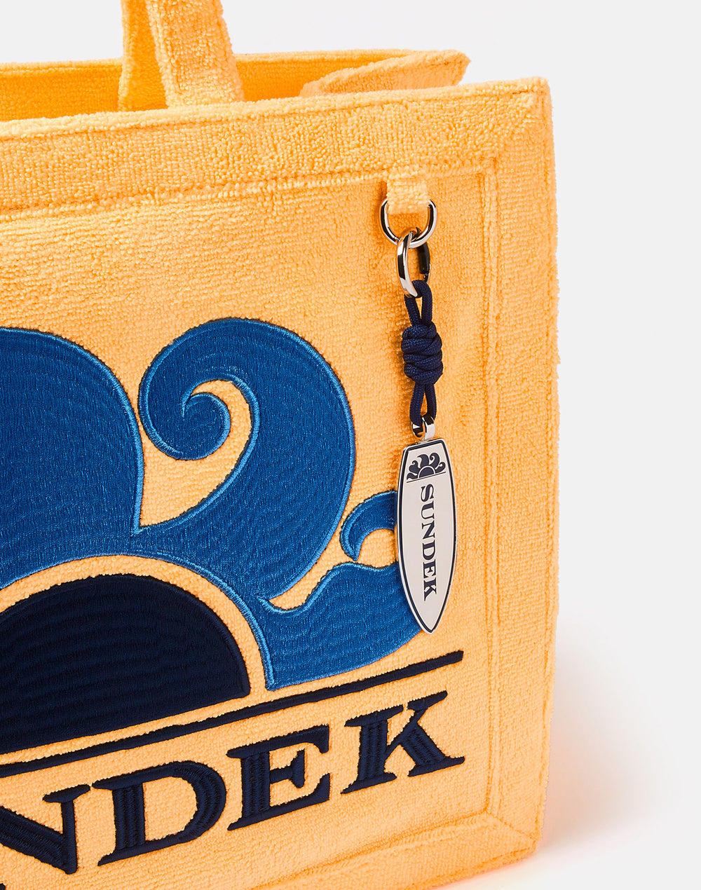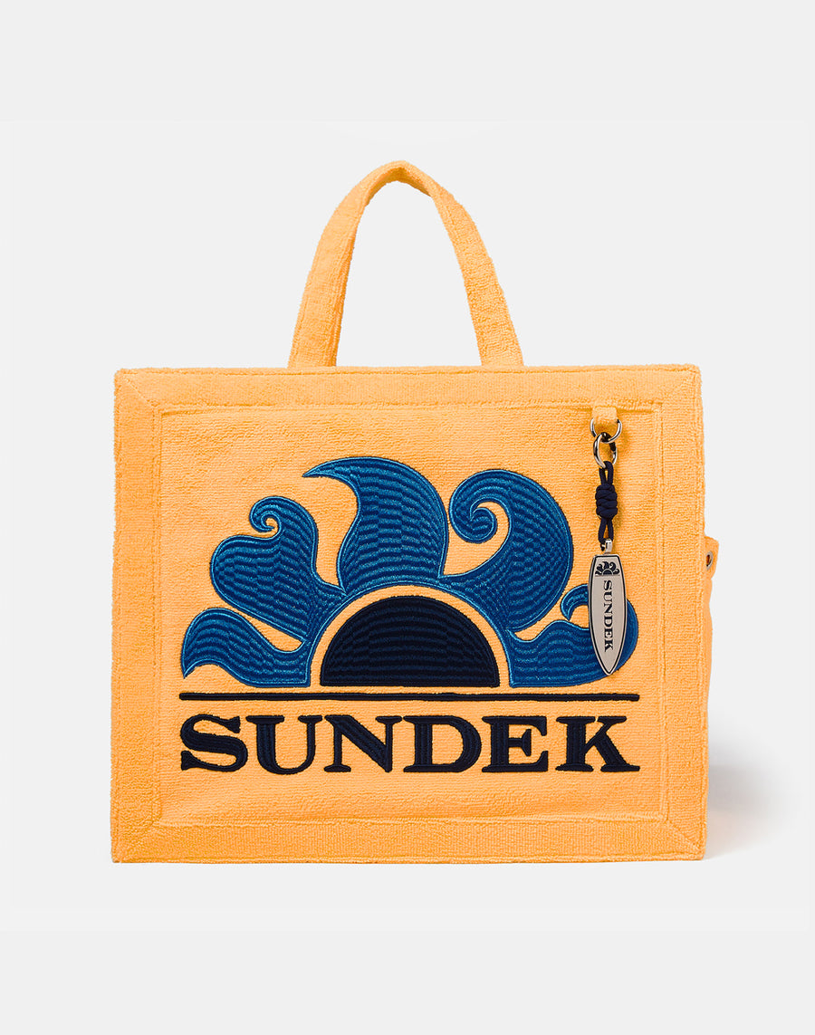 Borsa da mare a mano in spugna con logo ricamato. Charme con la caratteristica forma di tavola da surf.