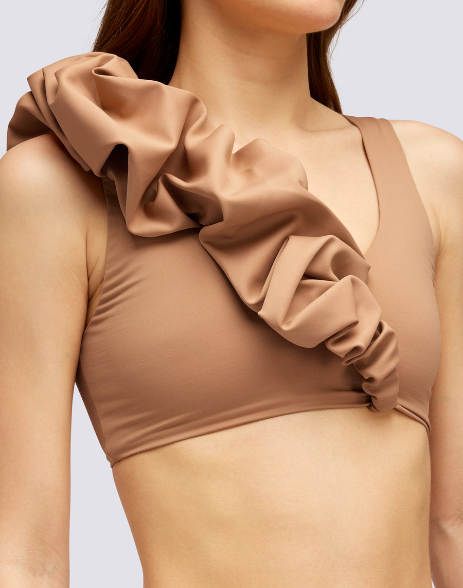 Un elegante rouche riveste questo top bralette senza coppe in morbida lycra, quasi a creare un effetto monospalla, per uno stile da spiaggia romantico, ricercato ed elegante. Abbinalo a una culotte a vita alta, a un pareo o indossalo sotto una blusa: l'effetto chic non mancherà.