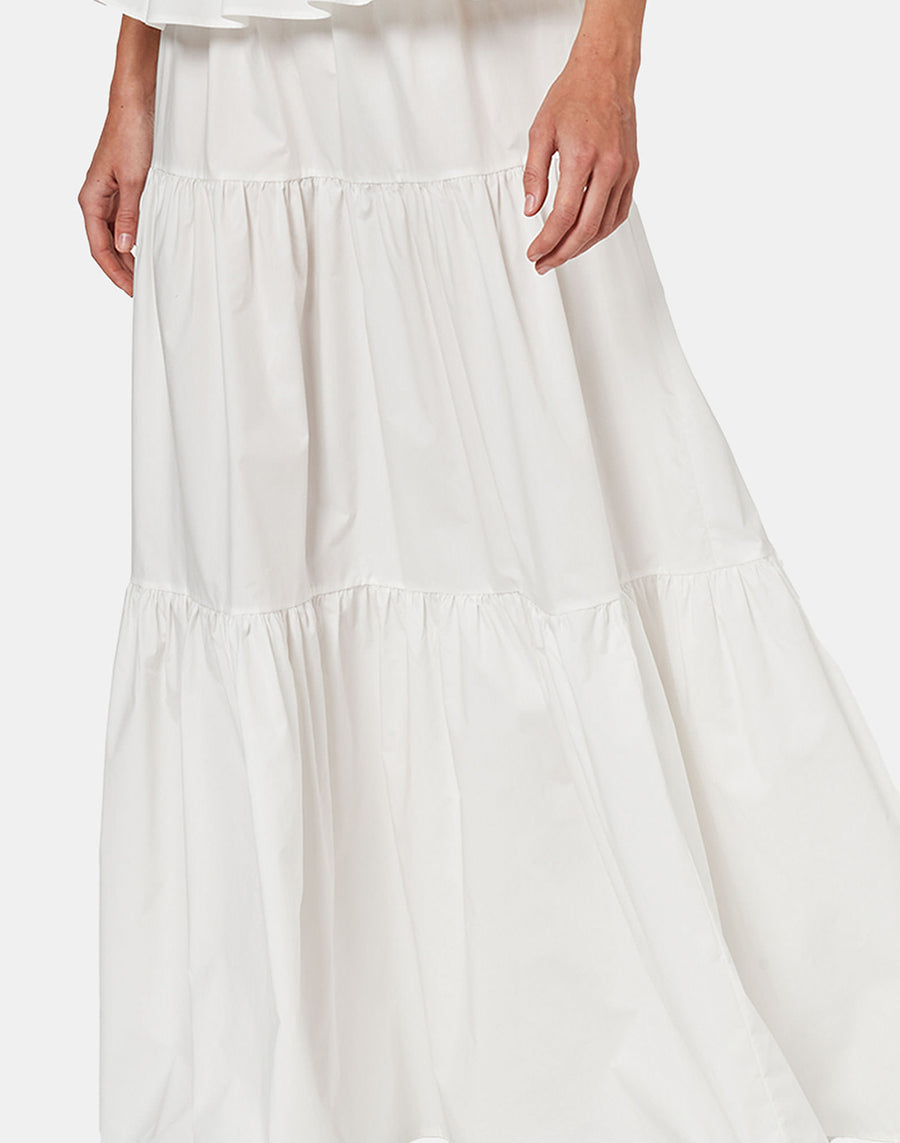 Volume maxi e costruzione femminile per la gonna lunga a balze in popeline di cotone. Versatile, da abbinare come vuoi.