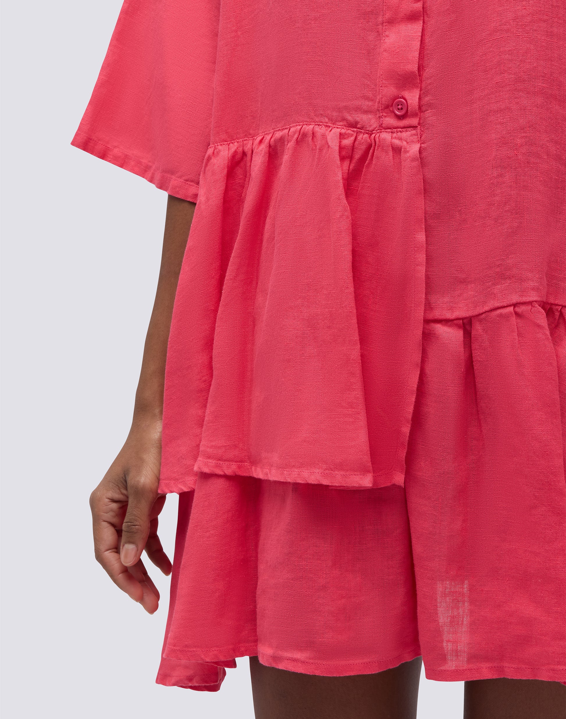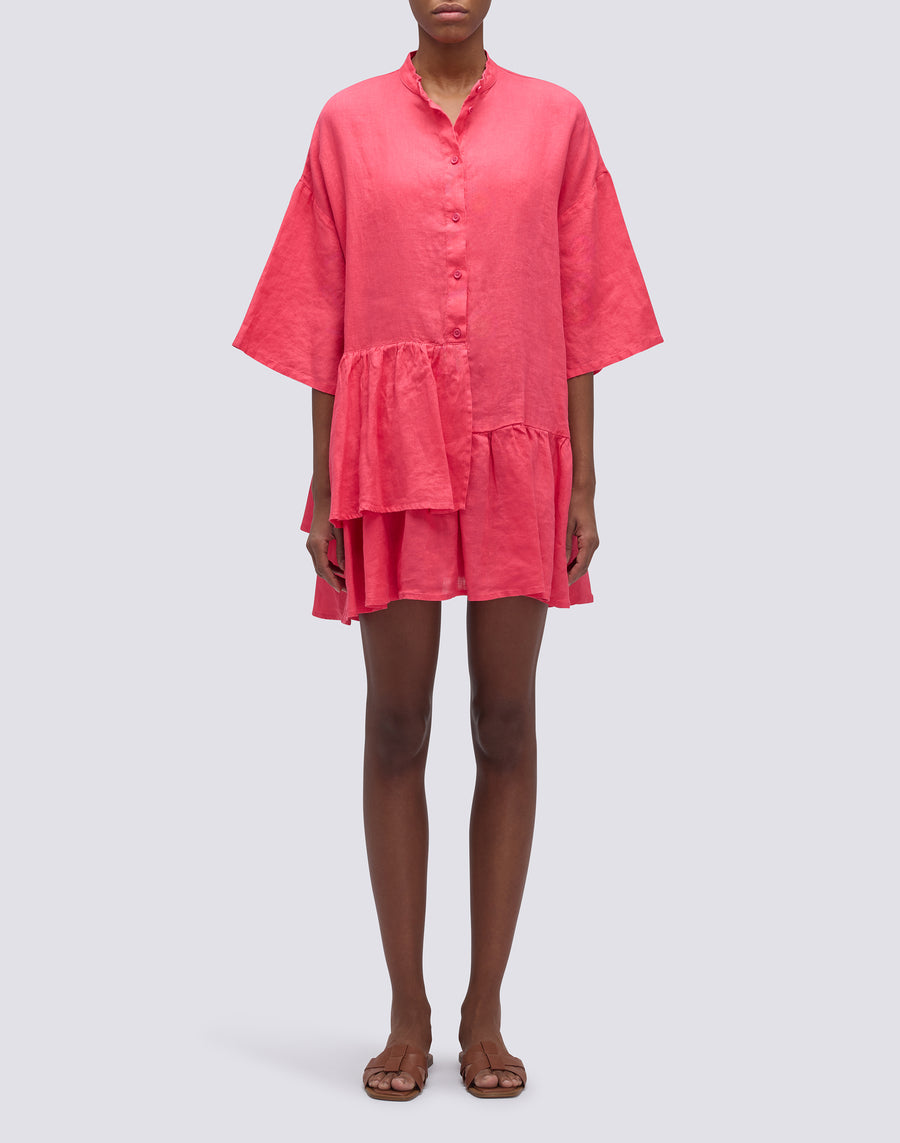 Tessuto leggero e fluttuante, proprio come le onde. Indossa questo abito corto asimmetrico in lino bianco e rendi speciali le tue occasioni.