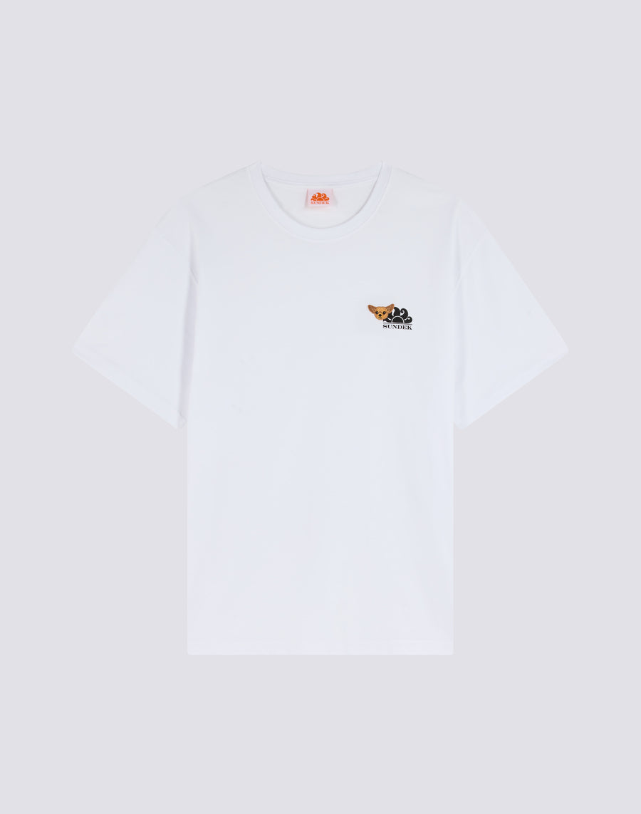 T-shirt in cotone della capsule esclusiva Sundek & Pelo Foundation. Questo modello raffigura un simpatico chihuahua, unendo la passione per il mare con l'affetto per i nostri amici animali.