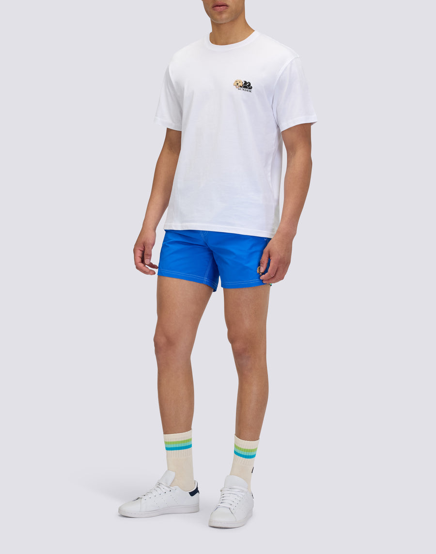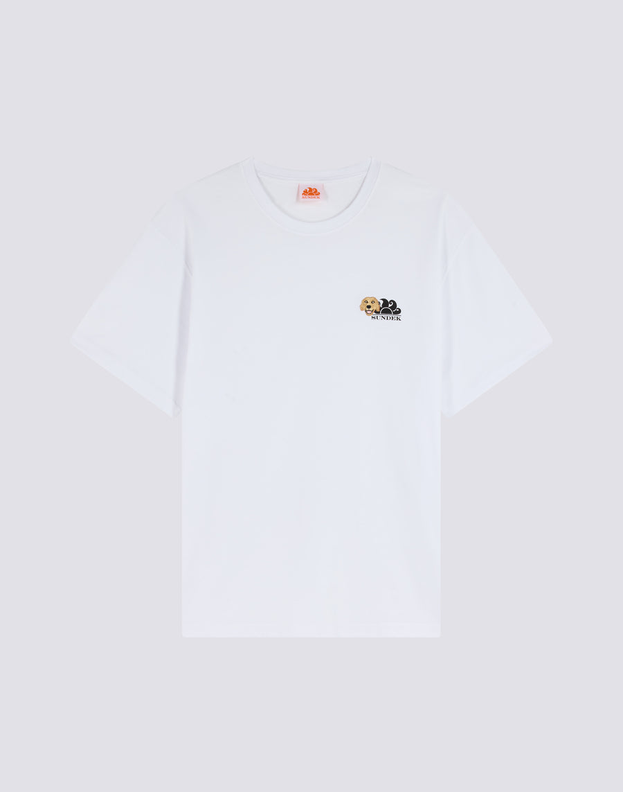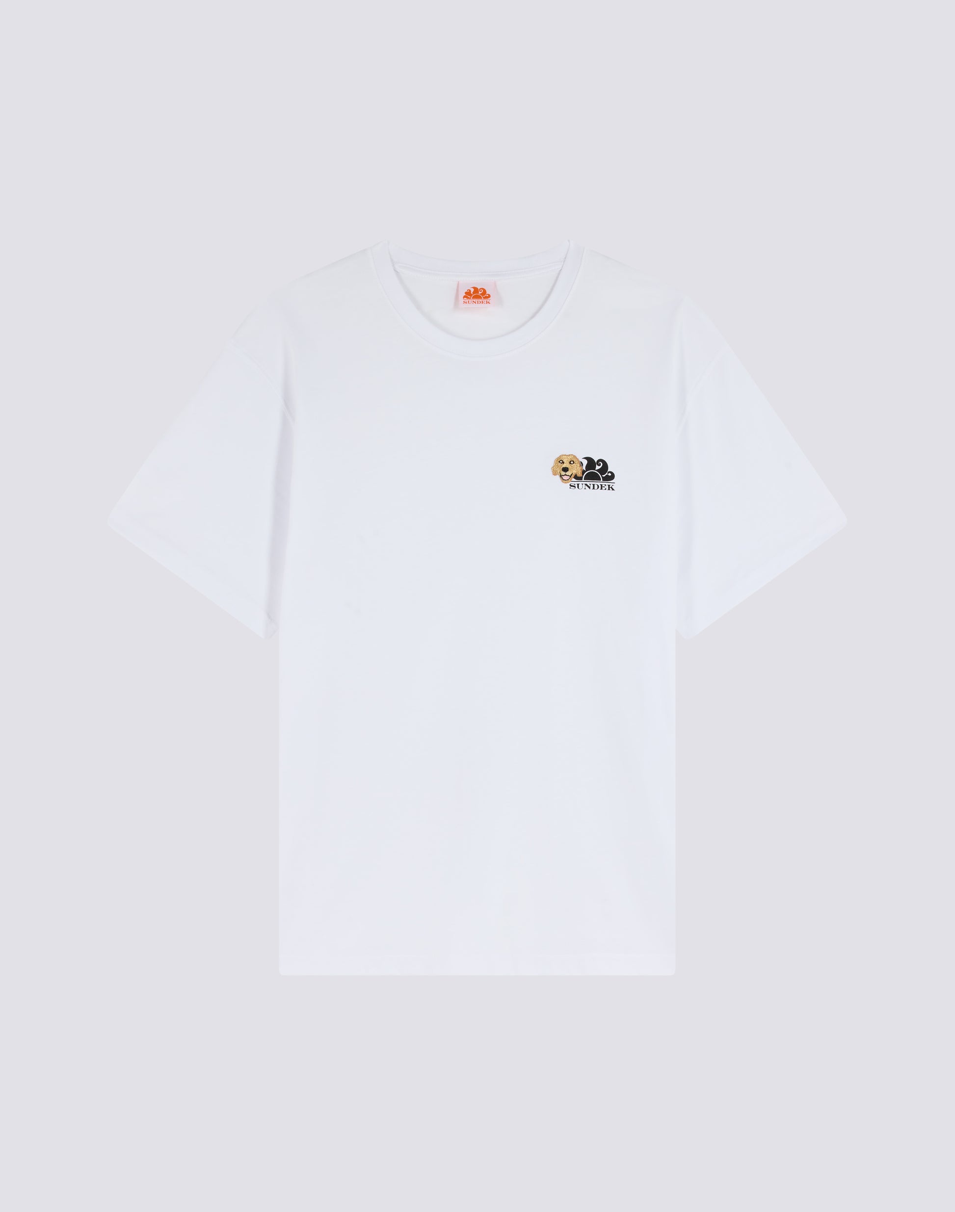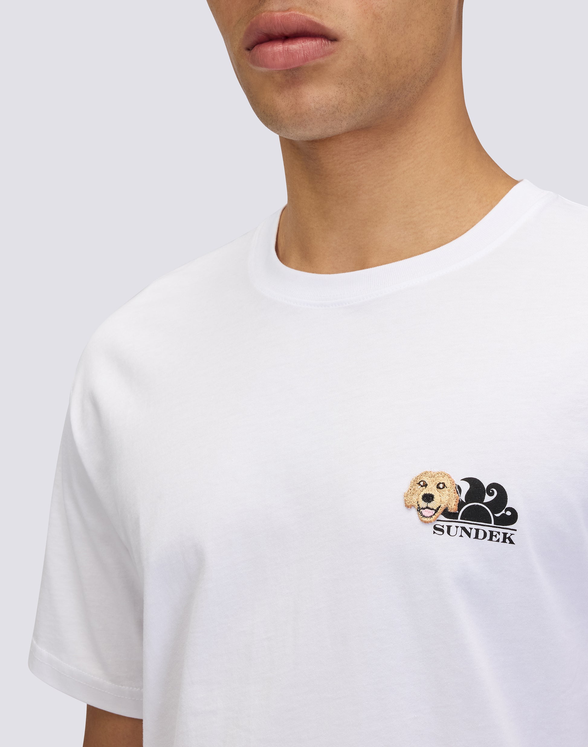 T-shirt in cotone della capsule esclusiva Sundek & Pelo Foundation. Questo modello raffigura un simpatico Golden Retriever, unendo la passione per il mare con l'affetto per i nostri amici animali.