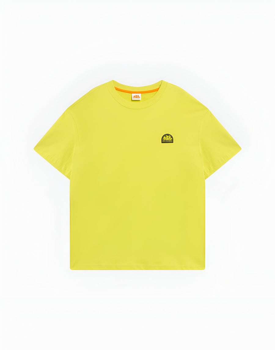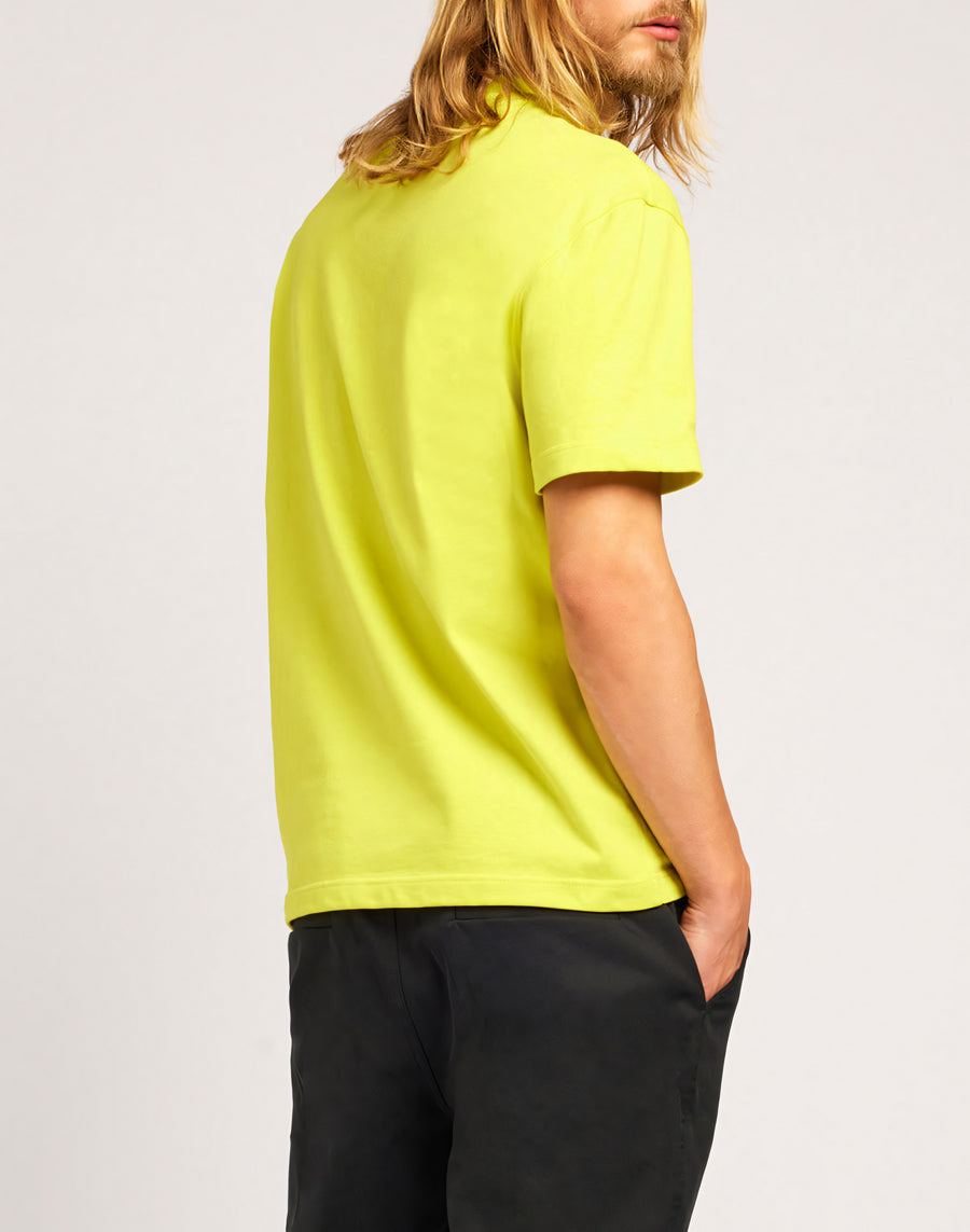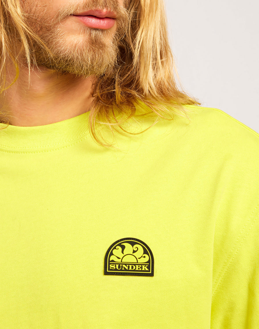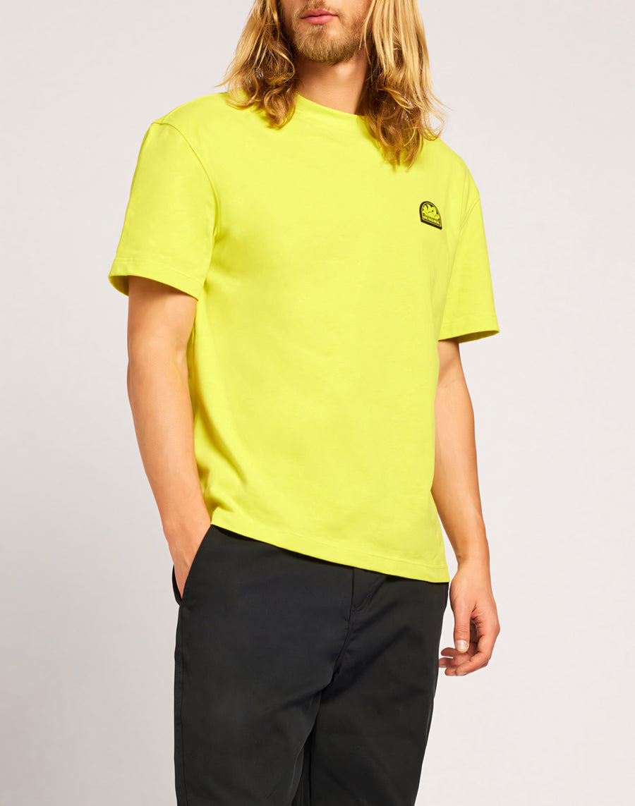 T-shirt da uomo a girocollo in morbido cotone jersey, con patch gommata sul petto. Vestibilità loose. Perfetta come protagonista di outfit casual.