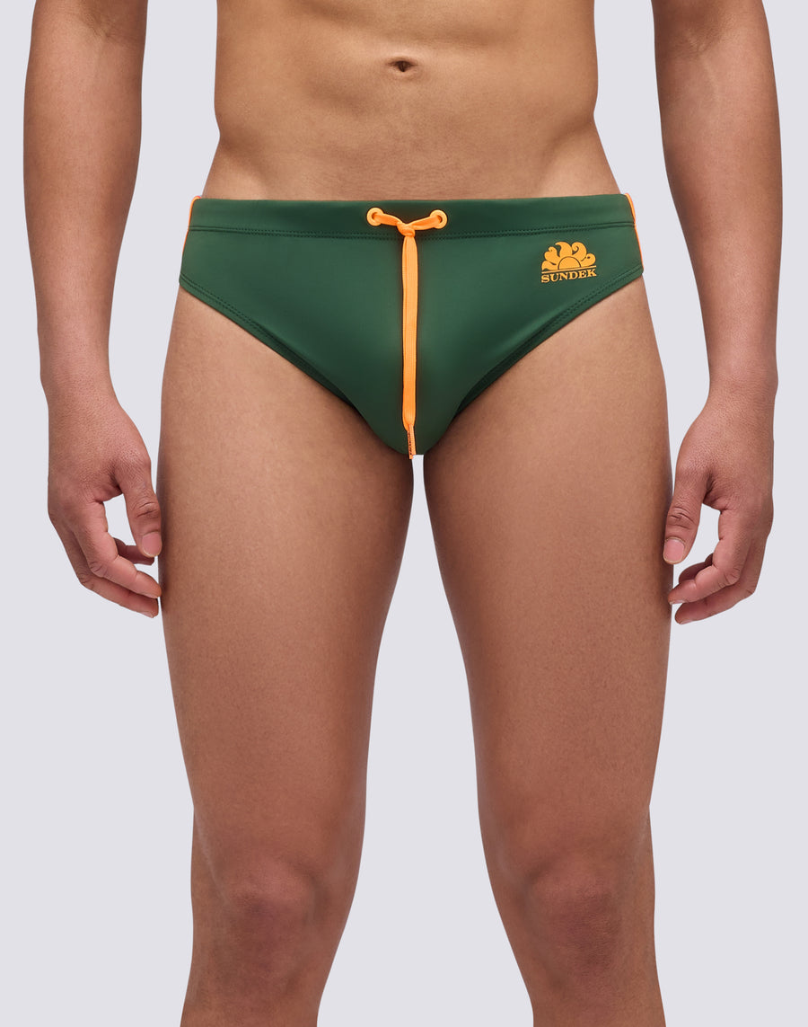 Costume slip uomo tinta unita e vita regolabile. Lo slip da mare monocromo con laccio coulisse e tre bande laterali colorate a contrasto per un look deciso e funzionale. Si asciuga velocemente e ti dà comfort e resistenza in acqua e fuori dall'acqua: indossalo per nuotare e allenarti e quando ti riposi e prendi il sole.