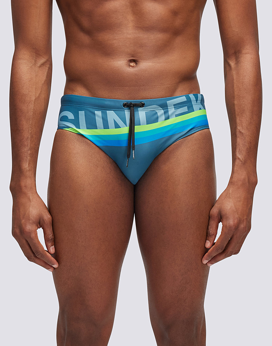 Slip da bagno uomo con stampa tricolor del logo Sundek. Dotato di coulisse e vita elasticizzata, è realizzato in tessuto riciclato. Lunghezza esterno coscia: 3,25”/8 cm (in taglia M).
