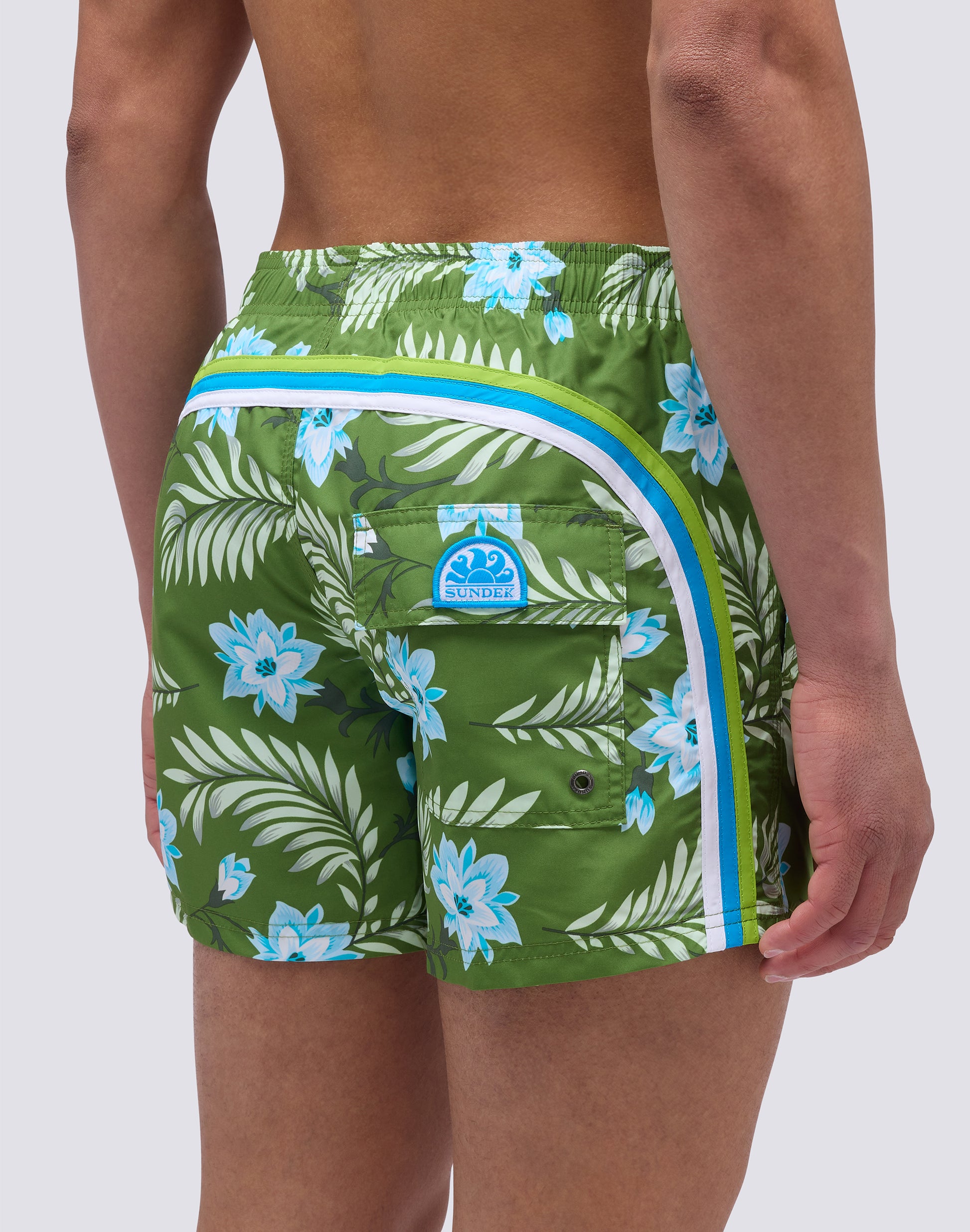 Costume da bagno a pantaloncino da uomo in tessuto Poliestere leggero, dall'asciugatura rapida. Dettaglio iconico arcobaleno Sundek sul back e stampa. Lunghezza esterno coscia 14”/35 CM (in taglia M).
