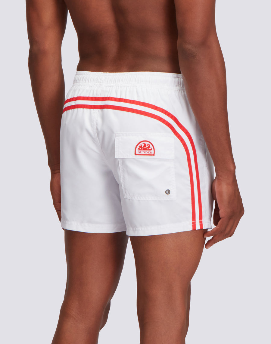 Costume da bagno a pantaloncino da uomo in tessuto riciclato Repreve®, tessuto super leggero dall'asciugatura rapida. Dettaglio iconico arcobaleno Sundek sul back e rappresentazione bandiera del Giappone. Lunghezza esterno coscia 14”/35 CM (in taglia M).
