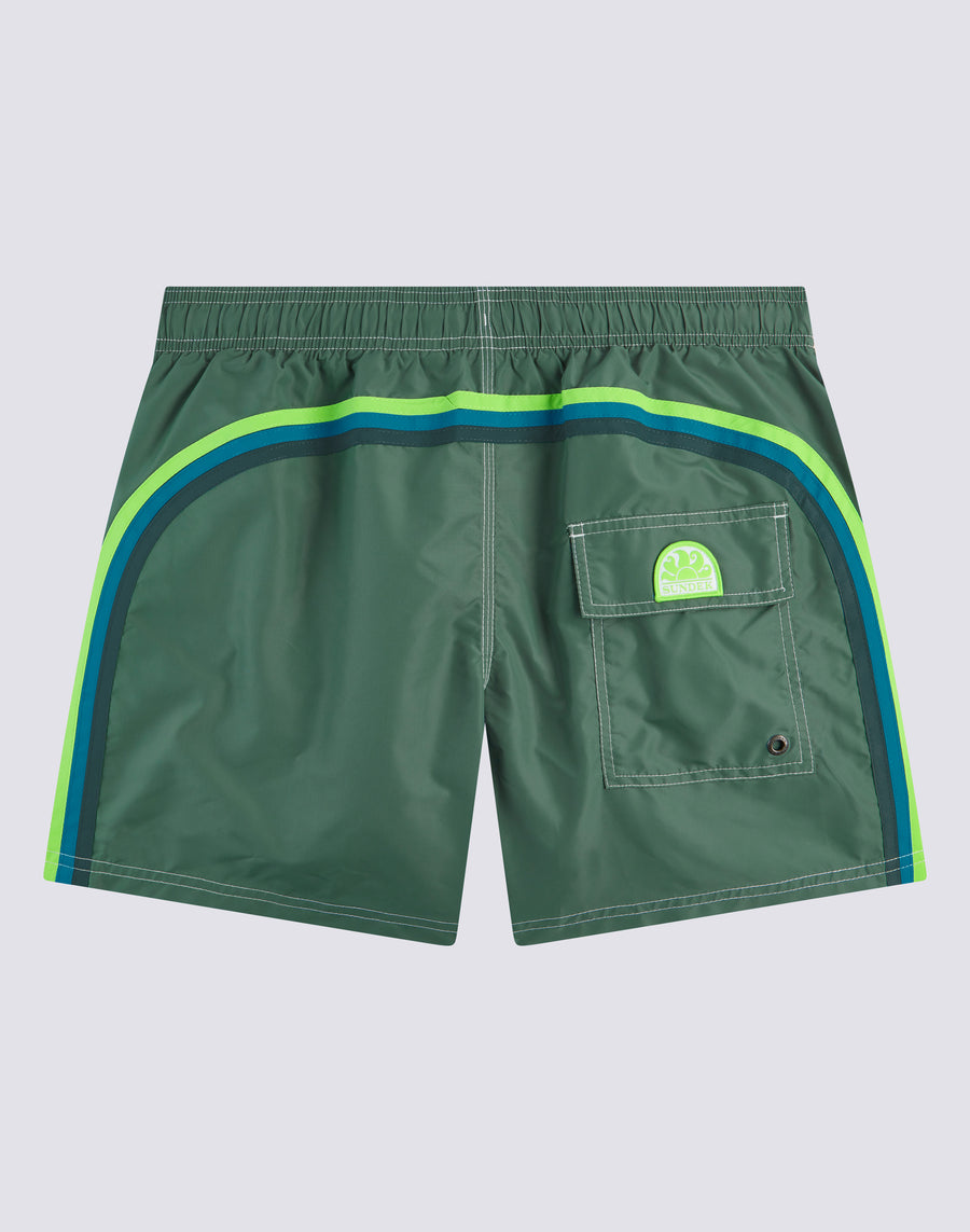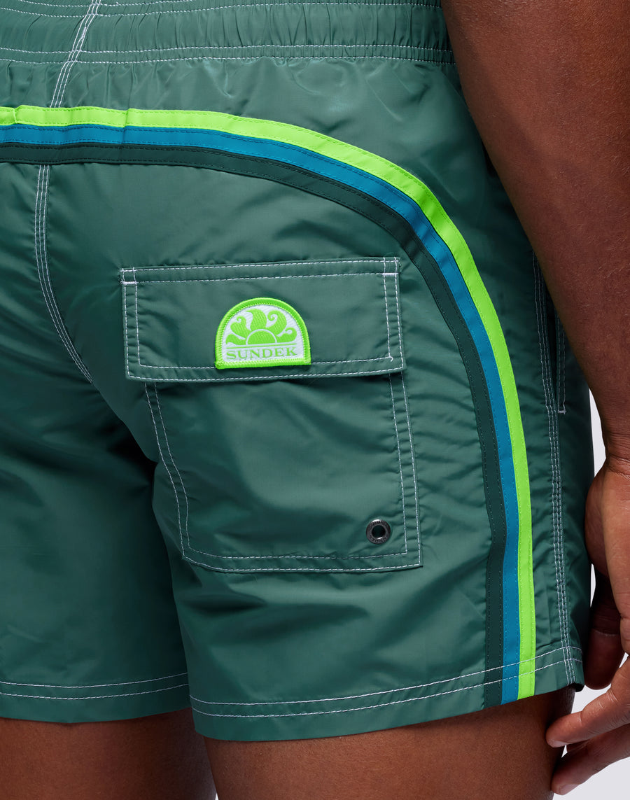 Shorts uomo mare corto e con vita elasticata, coulisse e iconico arcobaleno Sundek sul retro. Questo costume è realizzato con cuciture a tre aghi e al 100% con il nostro tessuto storico, il nylon-taffetà: liscio come la seta, leggero e resistente a tutto, si asciuga velocissimo per darti comodità ovunque, tra le onde e fuori dall'acqua. Lunghezza 35 cm (taglia M), misurati sul lato esterno della gamba.