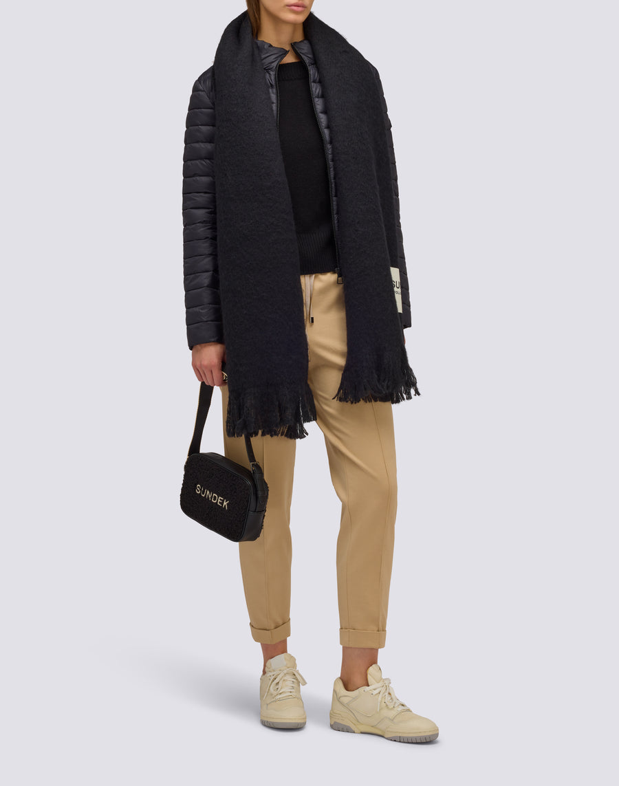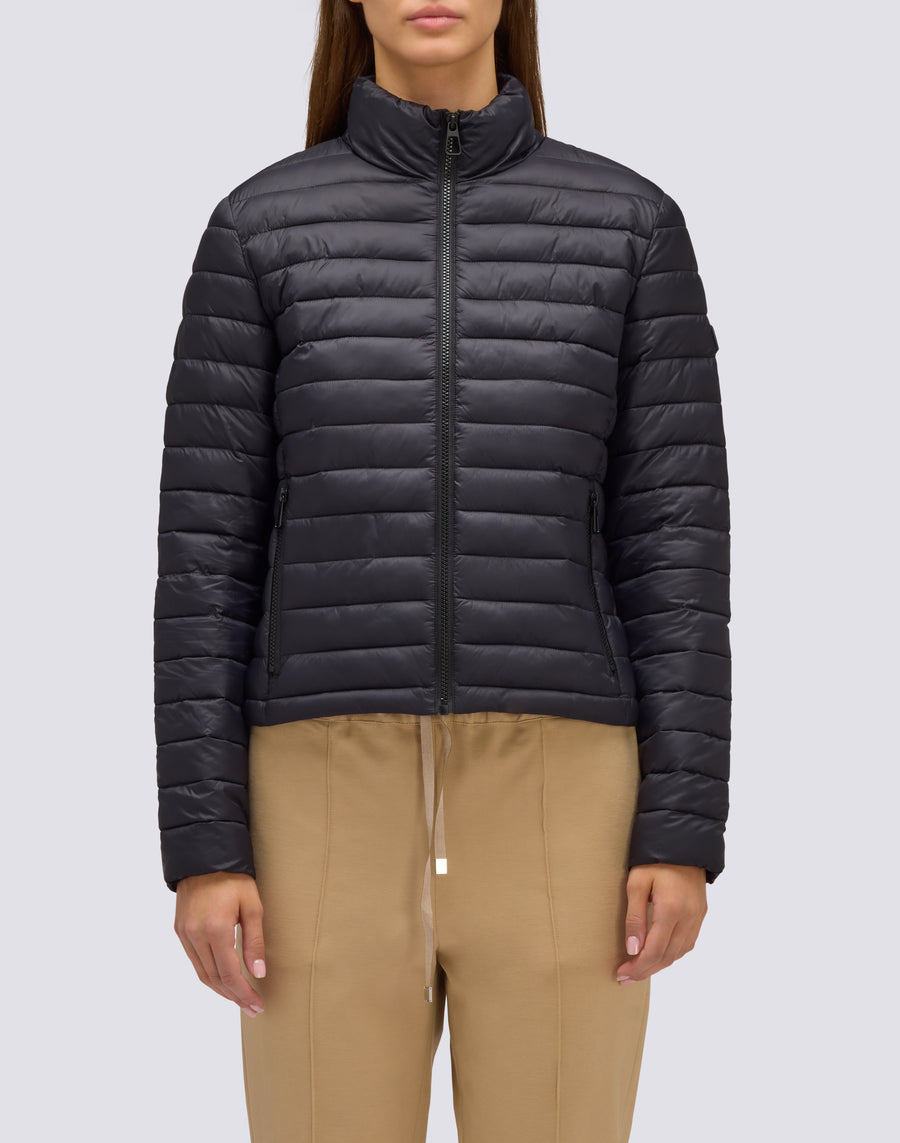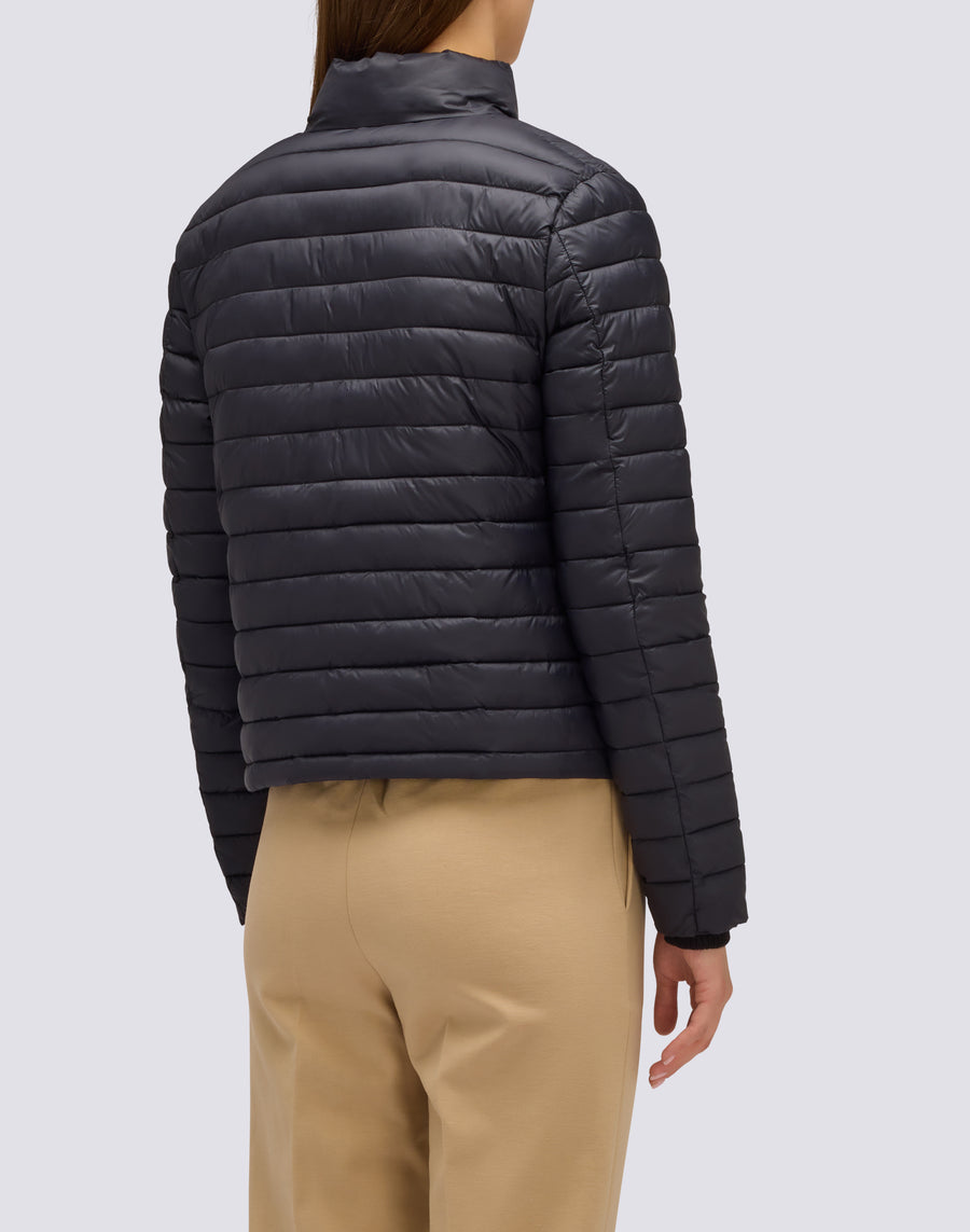 Piumino corto da donna con collo in piedi in tessuto nylon opaco superlight, trapuntato a canali orizzontali. L'imbottitura è fatta con una fibra sintetica innovativa Repreve, che dona leggerezza e protezione dal freddo. Il capo si completa di un packaging logato in nylon con coulisse regolabile. Vestibilità regular e grado di calore medio.