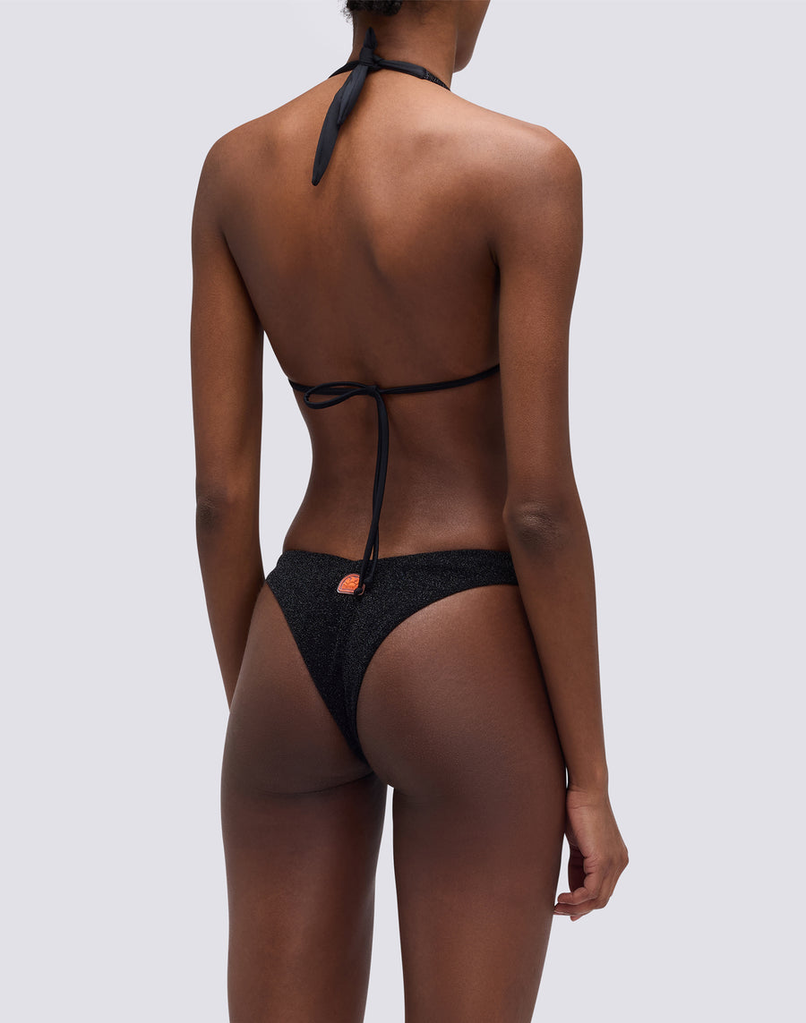 Top a triangolo americano dal deciso look glam grazie al fascino splendente e senza tempo del lurex.
