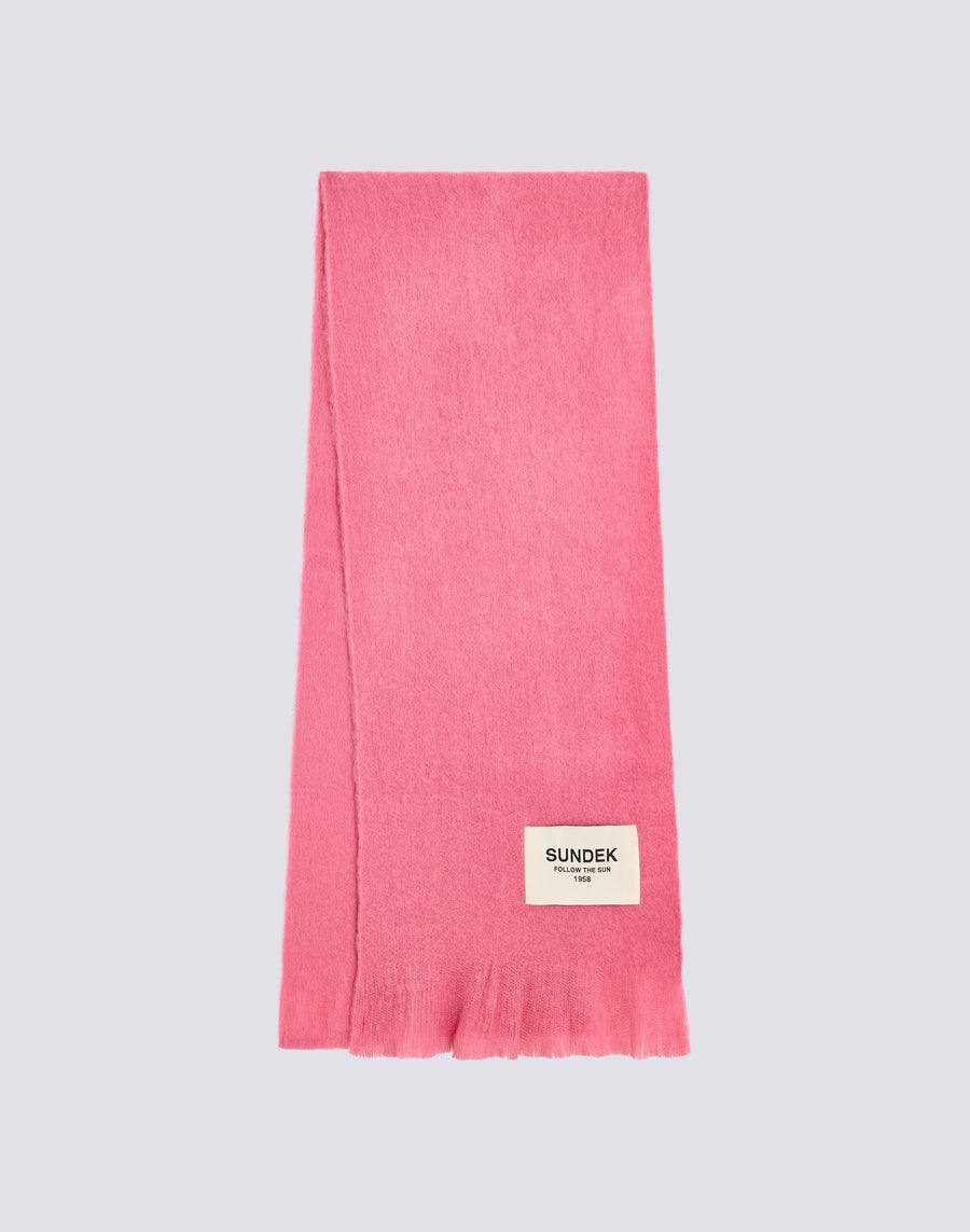 Écharpe unie, grande étiquette logo et mini franges, l'accessoire indispensable des journées d'hiver.