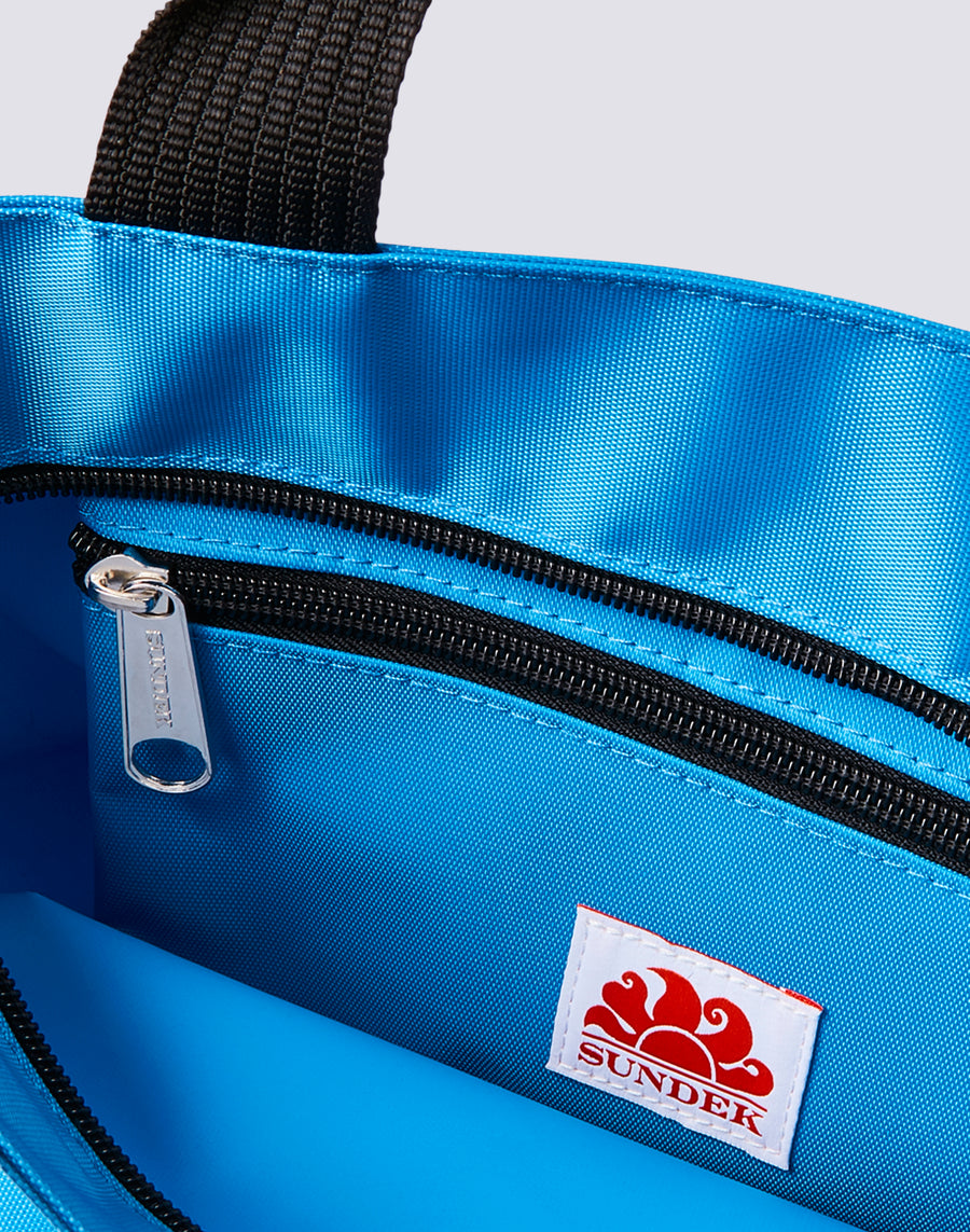 Mini sac à provisions caractérisé par une double poignée, une fermeture centrale avec fermeture éclair et une poche intérieure, également refermable avec fermeture éclair. Petit, pratique et fonctionnel pour toujours avoir tout l'essentiel avec soi.