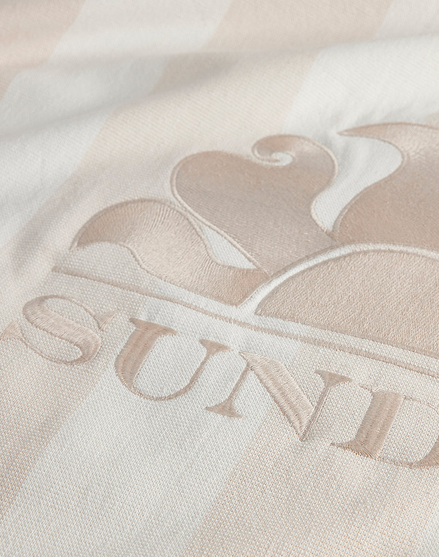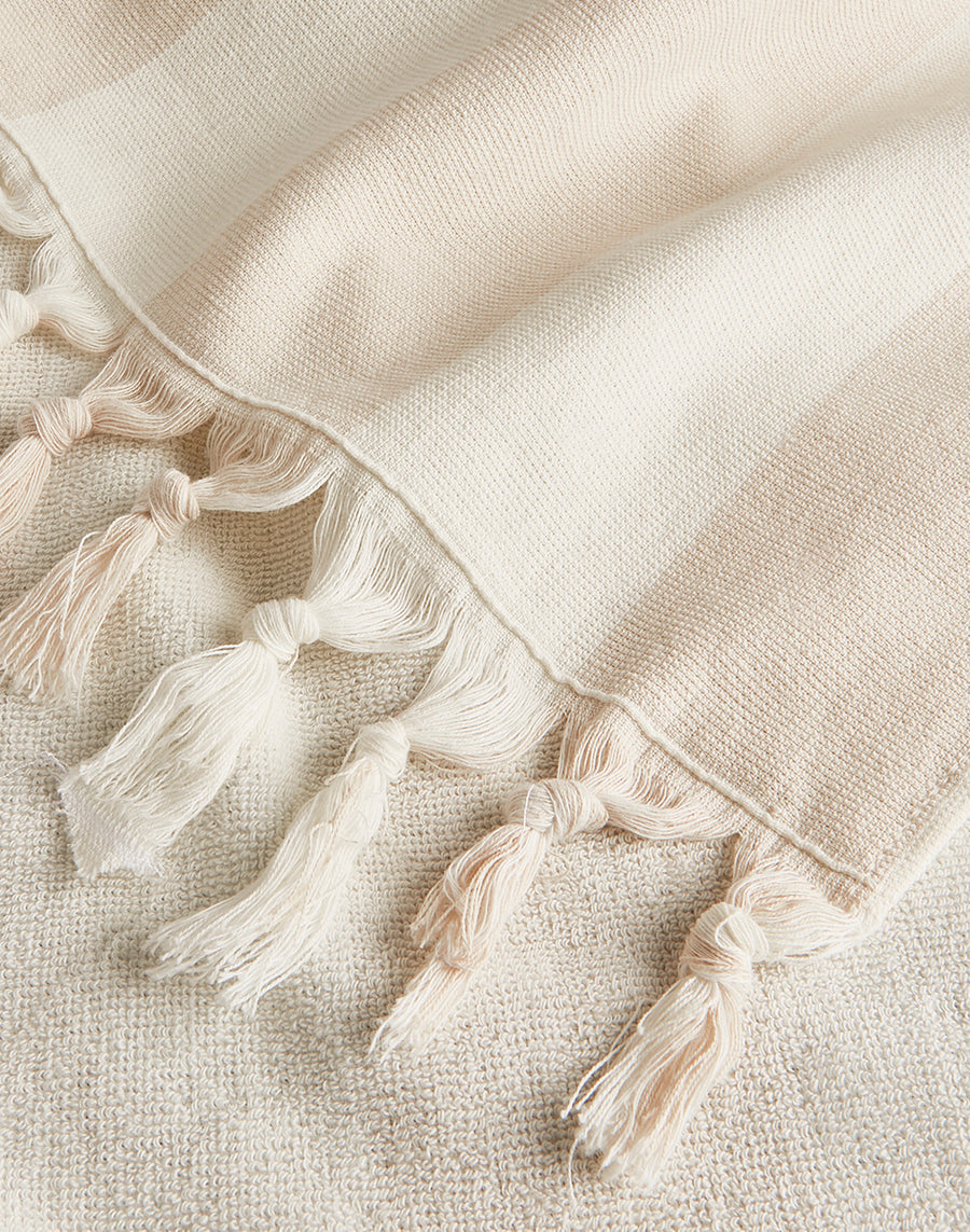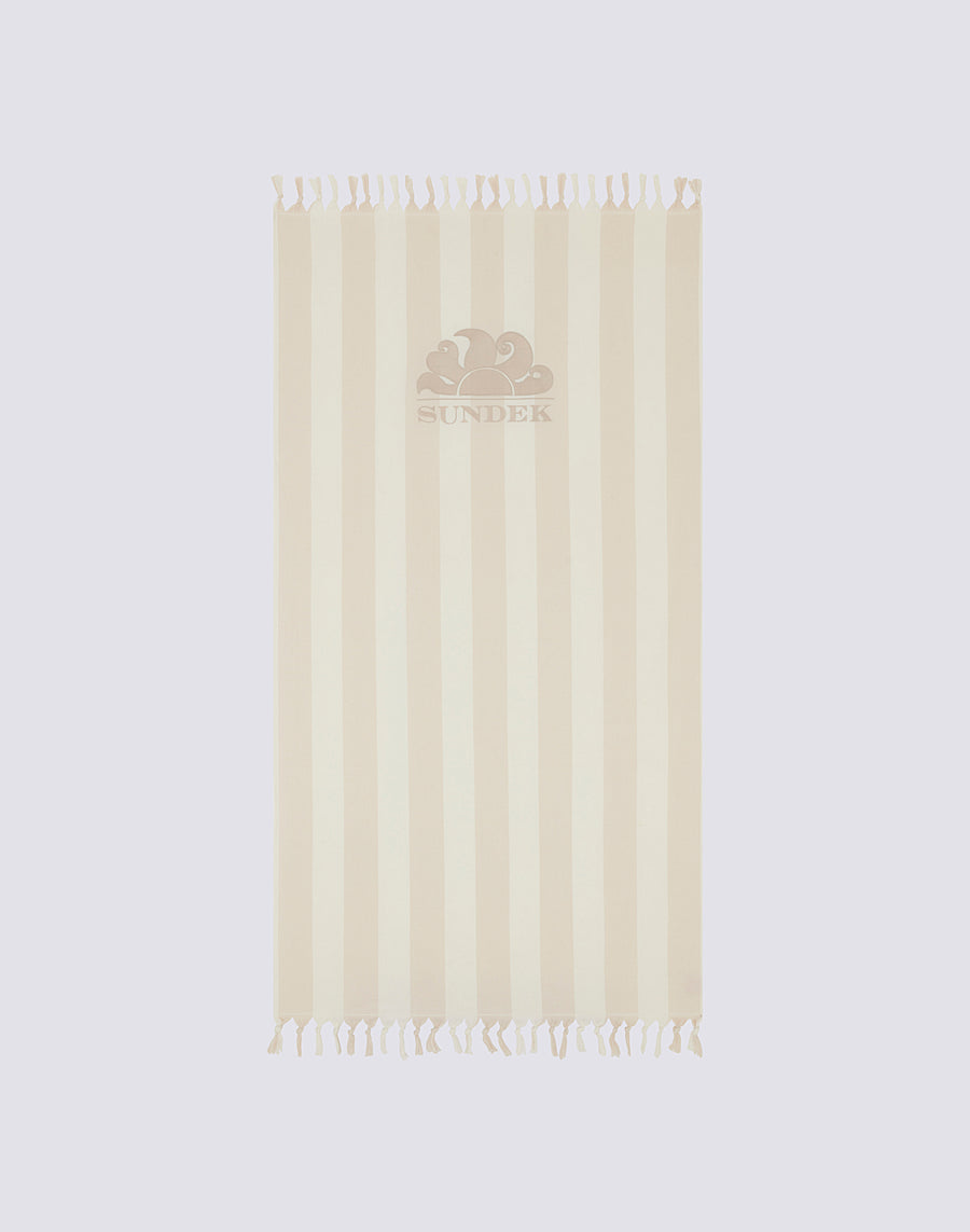 Drap de plage fouta jacquard avec maxi logo brodé en contraste de rayures verticales et bas à franges tissées. Longueur : 100x170cm. Poids : 330 grammes.