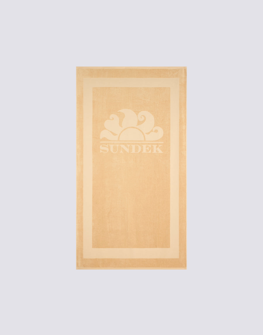 Drap de plage en éponge jacquard avec logo ton sur ton et bordure, tous deux en relief.