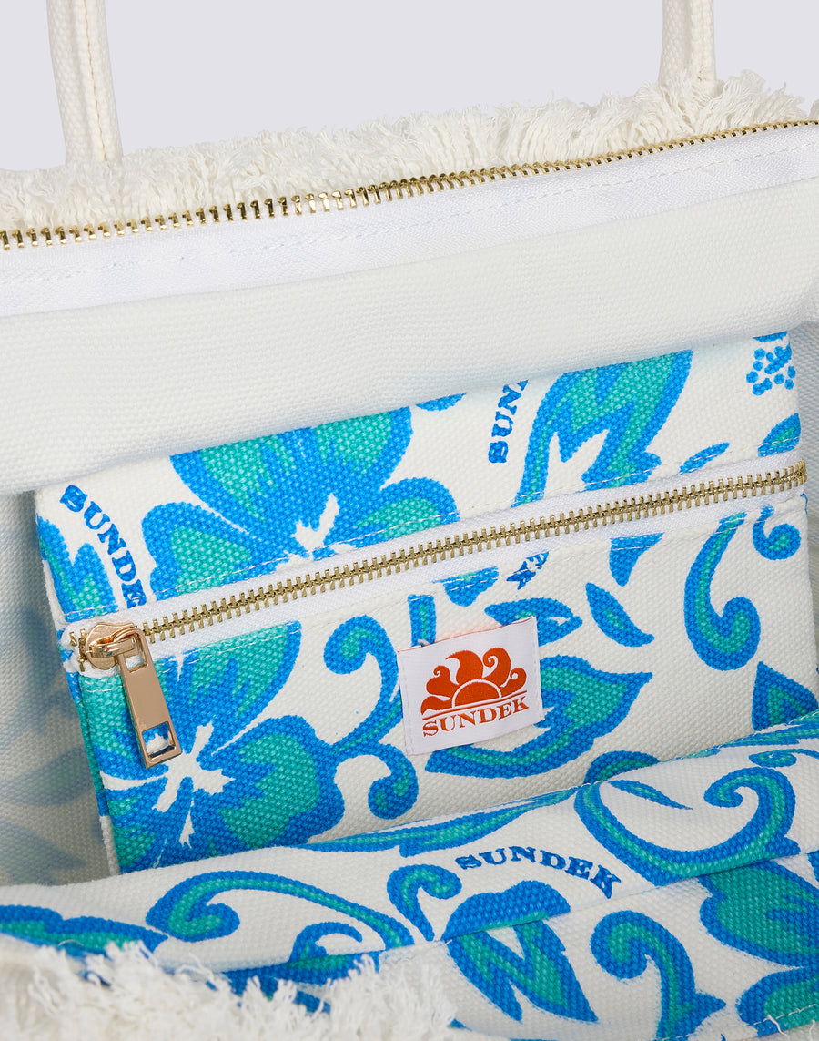 Sac cabas effet délavé, format standard, avec imprimé SK23, franges ton sur ton, fermeture zippée et finitions dorées. Coloré, audacieux, spacieux, parfait comme sac à provisions ou sac de plage.