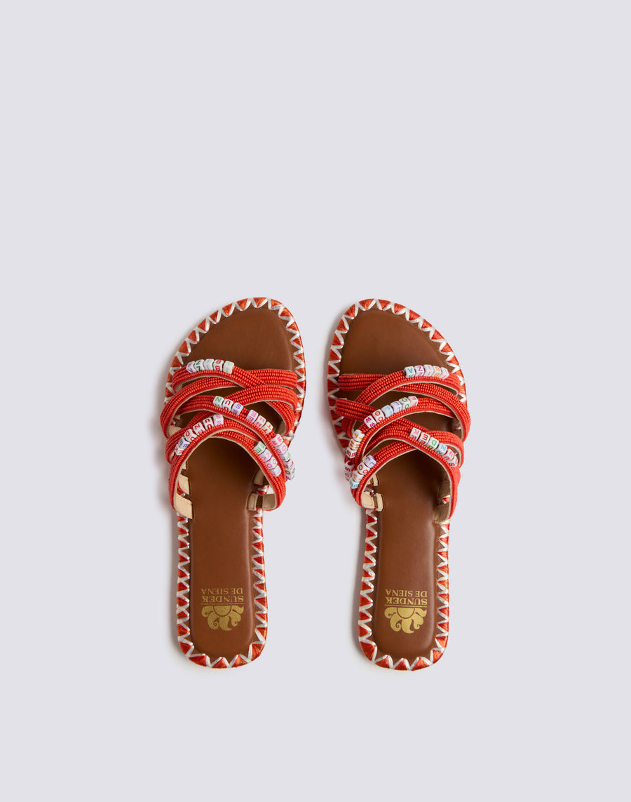 SEMELLE EXTÉRIEURE 100% CUIR DE BUFFLE SEMELLE INTÉRIEURE 100% CUIR DE MOUTON 100% PERLES DE VERRE CUBES EN PLASTIQUE RAPHIA 100% NATUREL