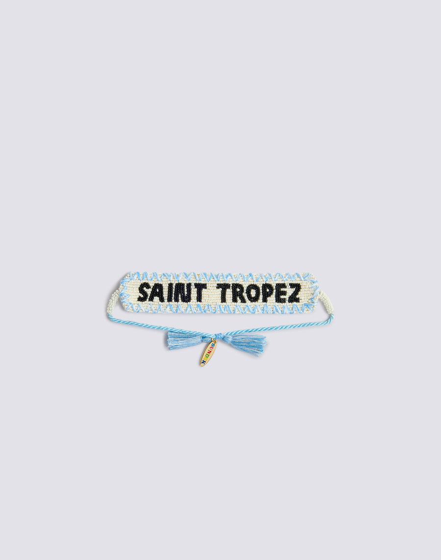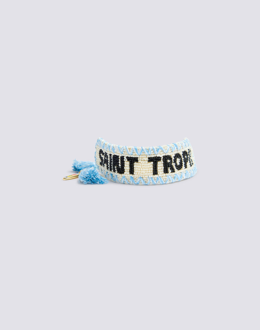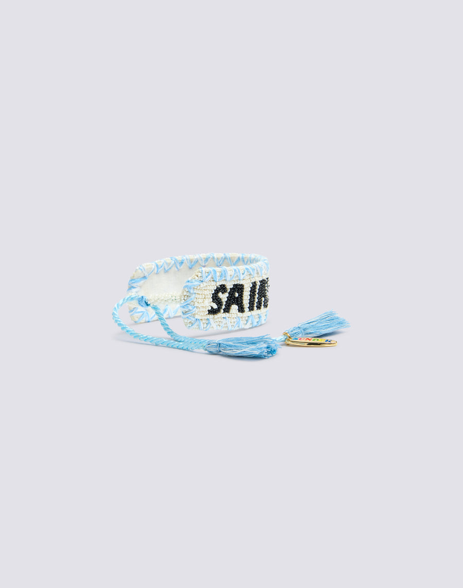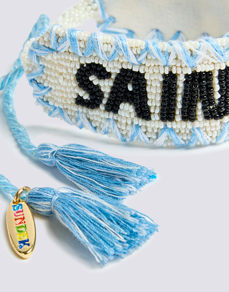 Bracelet brodé à la main avec des perles de verre. Doté d'une fermeture réglable avec des pompons sur le bas et d'une breloque en métal en forme de surf. Il est vendu avec son dustbag imprimé de notre motif emblématique SK23 et de notre logo doré.