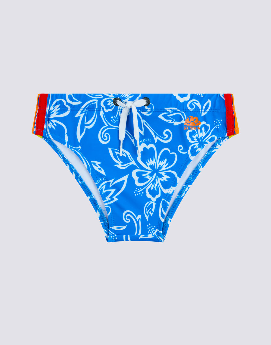 Slip de bain pour garçon avec imprimé Hibiscus d'archive et bandes tricolores sur les côtés. Taille élastique avec cordon de serrage pour ajuster la taille. Longueur 2,5"/6 cm (en taille 6 ans).