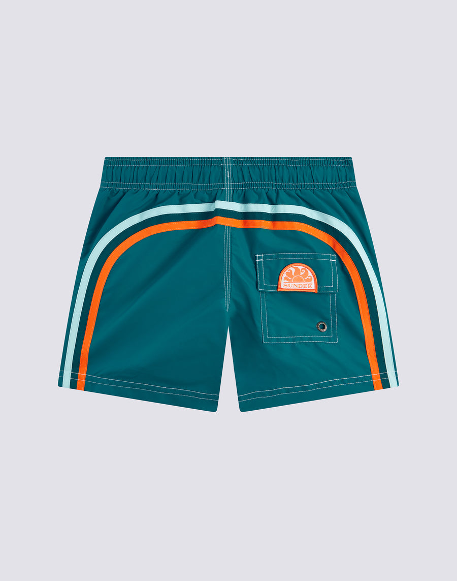 Couleur intense et matière hyper confortable à séchage rapide pour ce short de bain garçon. Un modèle qui accompagnera votre enfant dans ses mille activités de vacances, parfait pour bouger et jouer en toute liberté. il est fabriqué à partir de notre tissu en taffetas de nylon héritage et construit avec des coutures à trois aiguilles qui le rendent durable dans le temps. À ranger dans sa valise, année après année.