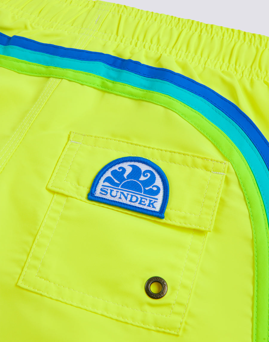 Couleur intense et matière hyper confortable à séchage rapide pour ce short de bain garçon. Un modèle qui accompagnera votre enfant dans ses mille activités de vacances, parfait pour bouger et jouer en toute liberté. il est fabriqué à partir de notre tissu en taffetas de nylon héritage et construit avec des coutures à trois aiguilles qui le rendent durable dans le temps. À ranger dans sa valise, année après année.