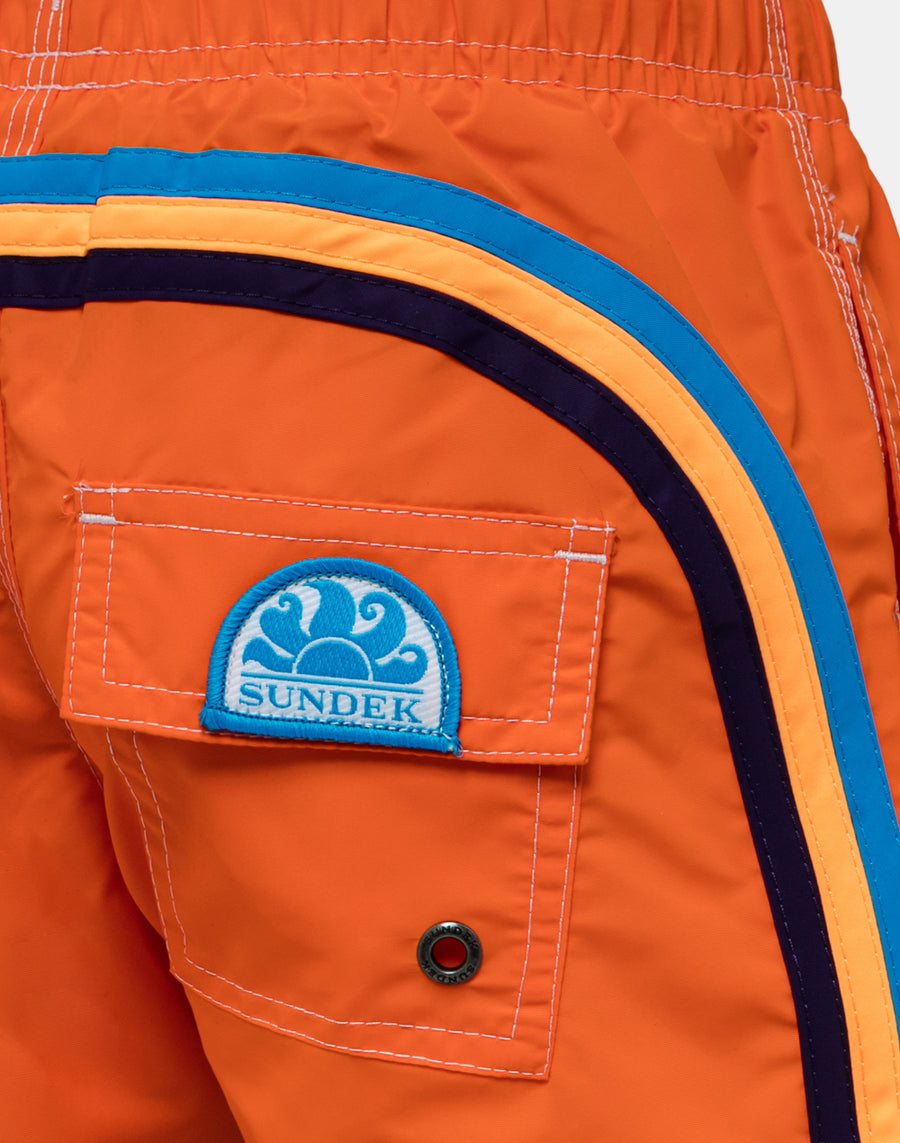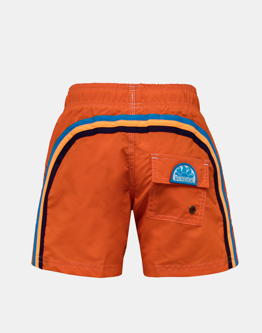 Couleur intense et tissu ultra-confortable à séchage rapide pour ce short de bain pour garçon. Un modèle qui accompagnera votre enfant dans toutes ses activités pendant les vacances, parfait pour bouger et jouer en toute liberté. Il est réalisé dans notre tissu historique en nylon taffetas et confectionné avec des coutures à trois aiguilles qui le rendent résistant dans le temps. À glisser dans la valise, année après année.