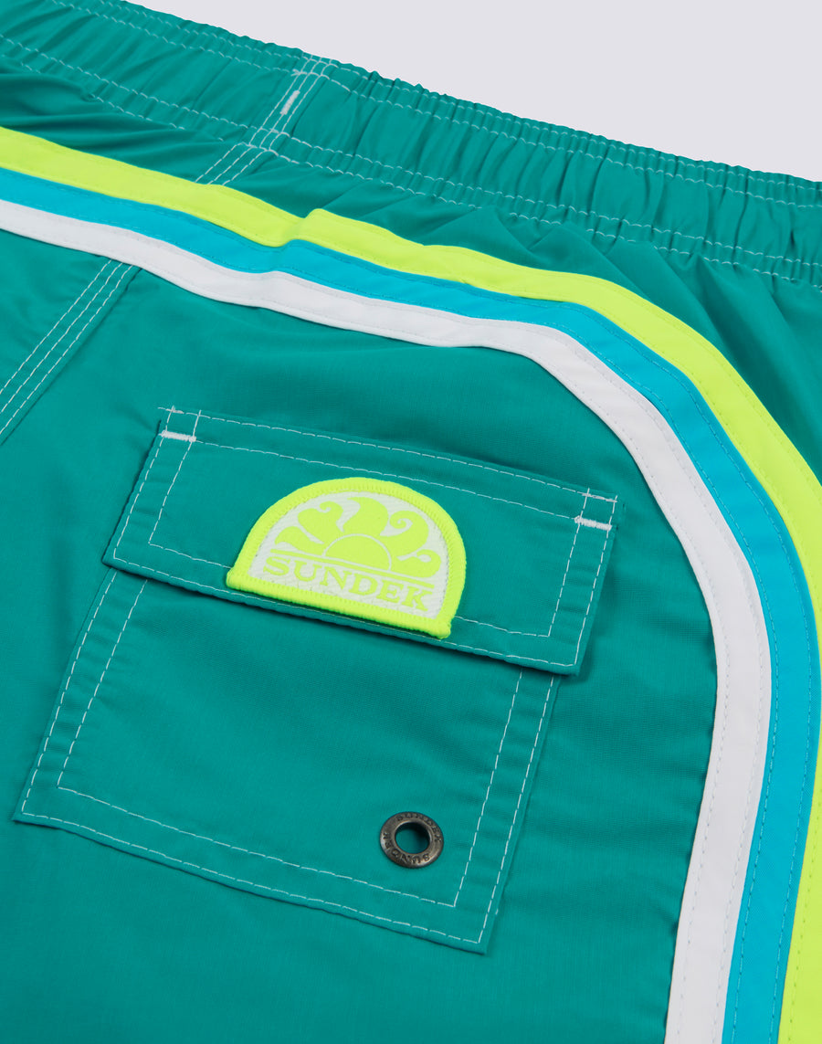 Couleur intense et matière hyper confortable à séchage rapide pour ce short de bain garçon. Un modèle qui accompagnera votre enfant dans ses mille activités de vacances, parfait pour bouger et jouer en toute liberté. il est fabriqué à partir de notre tissu en taffetas de nylon héritage et construit avec des coutures à trois aiguilles qui le rendent durable dans le temps. À ranger dans sa valise, année après année.